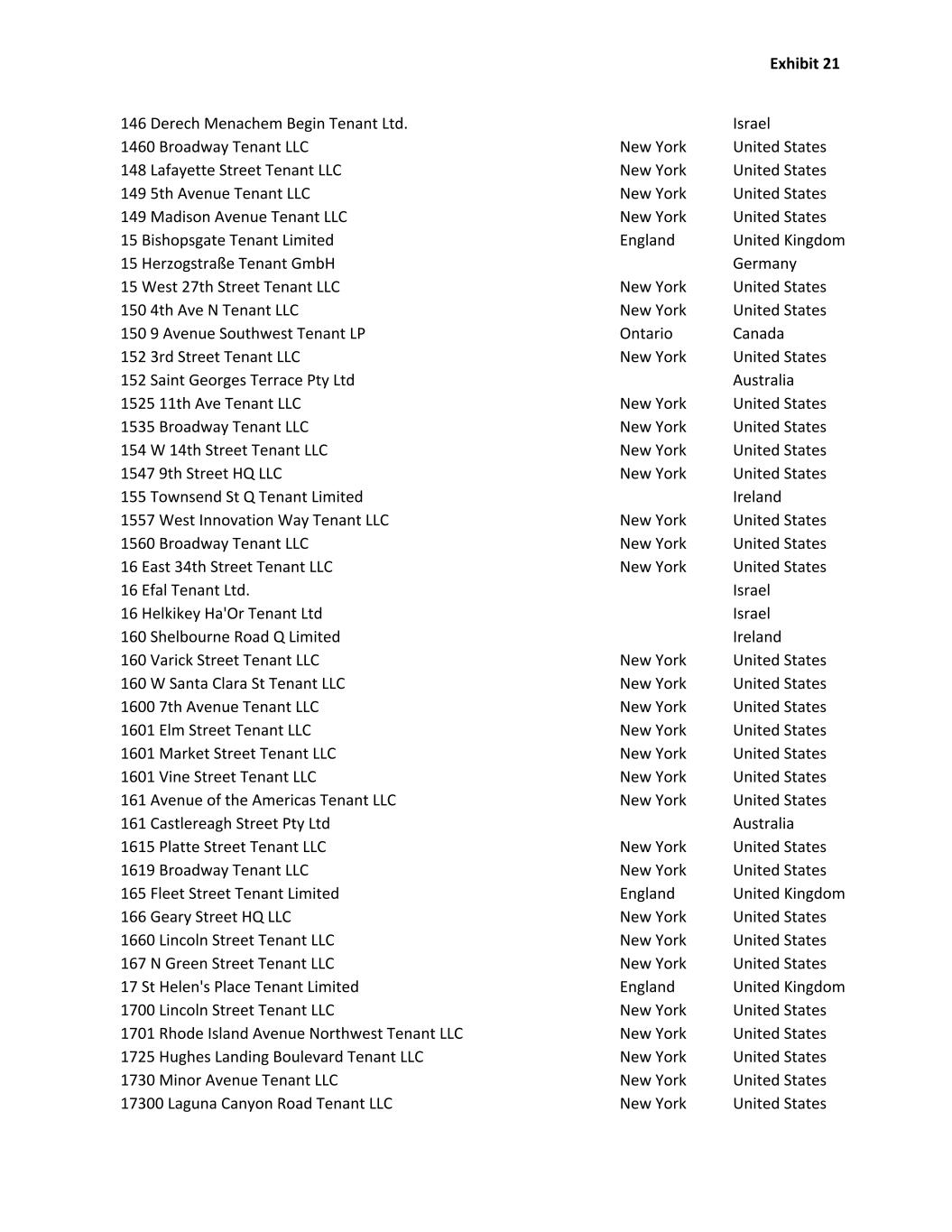 146 Derech Menachem Begin Tenant Ltd. Israel 1460 Broadway Tenant LLC New York United States 148 Lafayette Street Tenant LLC New York United States 149 5th Avenue Tenant LLC New York United States 149 Madison Avenue Tenant LLC New York United States 15 Bishopsgate Tenant Limited England United Kingdom 15 Herzogstraße Tenant GmbH Germany 15 West 27th Street Tenant LLC New York United States 150 4th Ave N Tenant LLC New York United States 150 9 Avenue Southwest Tenant LP Ontario Canada 152 3rd Street Tenant LLC New York United States 152 Saint Georges Terrace Pty Ltd Australia 1525 11th Ave Tenant LLC New York United States 1535 Broadway Tenant LLC New York United States 154 W 14th Street Tenant LLC New York United States 1547 9th Street HQ LLC New York United States 155 Townsend St Q Tenant Limited Ireland 1557 West Innovation Way Tenant LLC New York United States 1560 Broadway Tenant LLC New York United States 16 East 34th Street Tenant LLC New York United States 16 Efal Tenant Ltd. Israel 16 Helkikey Ha'Or Tenant Ltd Israel 160 Shelbourne Road Q Limited Ireland 160 Varick Street Tenant LLC New York United States 160 W Santa Clara St Tenant LLC New York United States 1600 7th Avenue Tenant LLC New York United States 1601 Elm Street Tenant LLC New York United States 1601 Market Street Tenant LLC New York United States 1601 Vine Street Tenant LLC New York United States 161 Avenue of the Americas Tenant LLC New York United States 161 Castlereagh Street Pty Ltd Australia 1615 Platte Street Tenant LLC New York United States 1619 Broadway Tenant LLC New York United States 165 Fleet Street Tenant Limited England United Kingdom 166 Geary Street HQ LLC New York United States 1660 Lincoln Street Tenant LLC New York United States 167 N Green Street Tenant LLC New York United States 17 St Helen's Place Tenant Limited England United Kingdom 1700 Lincoln Street Tenant LLC New York United States 1701 Rhode Island Avenue Northwest Tenant LLC New York United States 1725 Hughes Landing Boulevard Tenant LLC New York United States 1730 Minor Avenue Tenant LLC New York United States 17300 Laguna Canyon Road Tenant LLC New York United States Exhibit 21