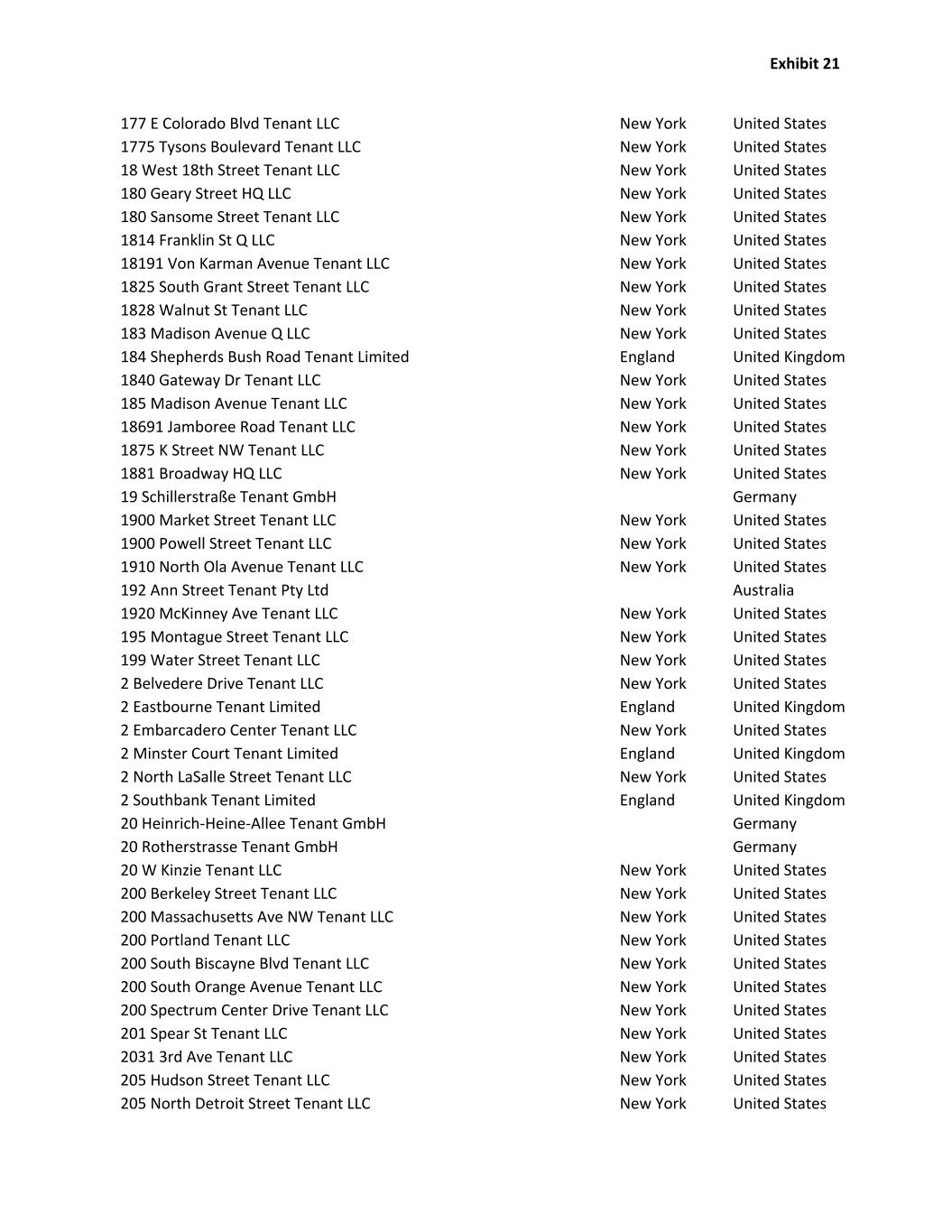 177 E Colorado Blvd Tenant LLC New York United States 1775 Tysons Boulevard Tenant LLC New York United States 18 West 18th Street Tenant LLC New York United States 180 Geary Street HQ LLC New York United States 180 Sansome Street Tenant LLC New York United States 1814 Franklin St Q LLC New York United States 18191 Von Karman Avenue Tenant LLC New York United States 1825 South Grant Street Tenant LLC New York United States 1828 Walnut St Tenant LLC New York United States 183 Madison Avenue Q LLC New York United States 184 Shepherds Bush Road Tenant Limited England United Kingdom 1840 Gateway Dr Tenant LLC New York United States 185 Madison Avenue Tenant LLC New York United States 18691 Jamboree Road Tenant LLC New York United States 1875 K Street NW Tenant LLC New York United States 1881 Broadway HQ LLC New York United States 19 Schillerstraße Tenant GmbH Germany 1900 Market Street Tenant LLC New York United States 1900 Powell Street Tenant LLC New York United States 1910 North Ola Avenue Tenant LLC New York United States 192 Ann Street Tenant Pty Ltd Australia 1920 McKinney Ave Tenant LLC New York United States 195 Montague Street Tenant LLC New York United States 199 Water Street Tenant LLC New York United States 2 Belvedere Drive Tenant LLC New York United States 2 Eastbourne Tenant Limited England United Kingdom 2 Embarcadero Center Tenant LLC New York United States 2 Minster Court Tenant Limited England United Kingdom 2 North LaSalle Street Tenant LLC New York United States 2 Southbank Tenant Limited England United Kingdom 20 Heinrich-Heine-Allee Tenant GmbH Germany 20 Rotherstrasse Tenant GmbH Germany 20 W Kinzie Tenant LLC New York United States 200 Berkeley Street Tenant LLC New York United States 200 Massachusetts Ave NW Tenant LLC New York United States 200 Portland Tenant LLC New York United States 200 South Biscayne Blvd Tenant LLC New York United States 200 South Orange Avenue Tenant LLC New York United States 200 Spectrum Center Drive Tenant LLC New York United States 201 Spear St Tenant LLC New York United States 2031 3rd Ave Tenant LLC New York United States 205 Hudson Street Tenant LLC New York United States 205 North Detroit Street Tenant LLC New York United States Exhibit 21