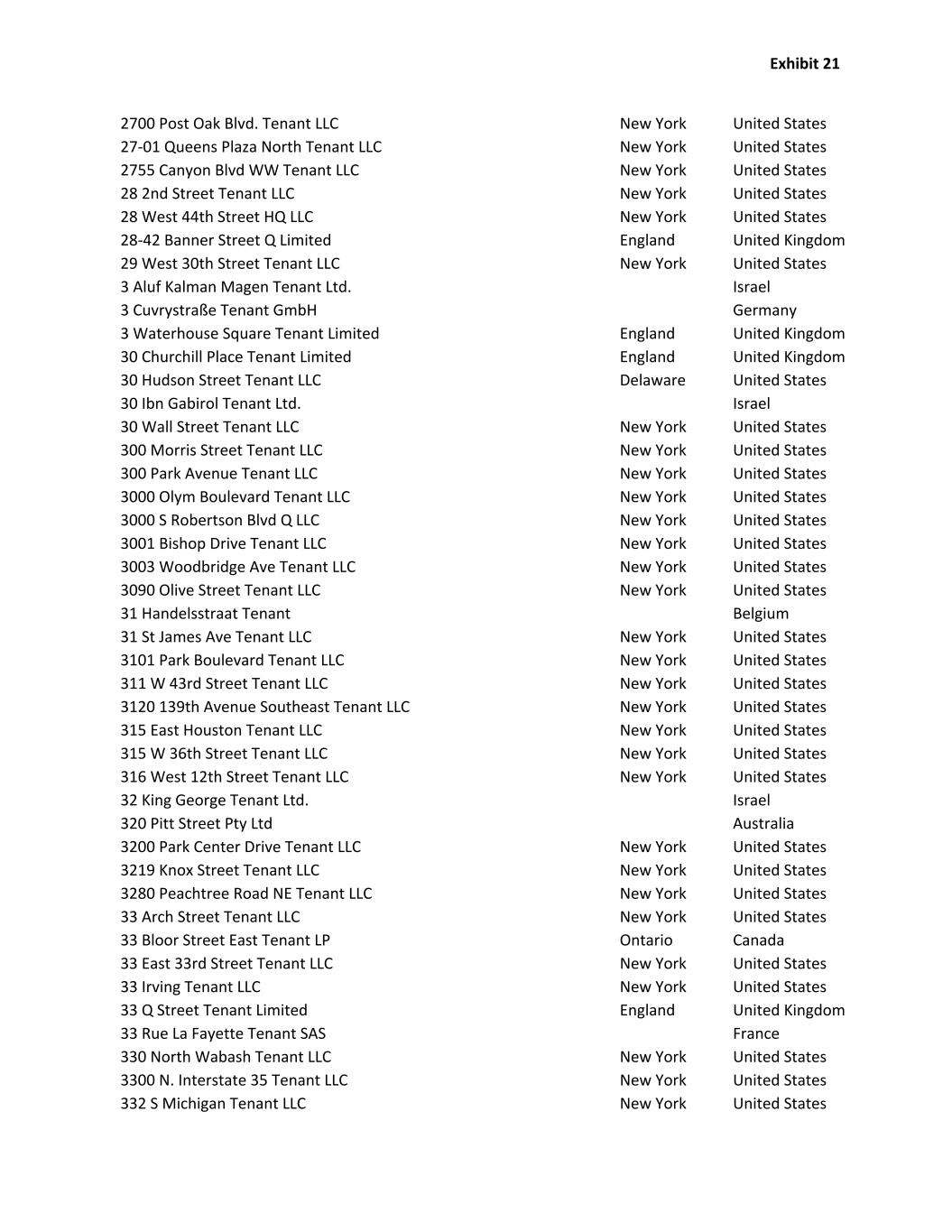 2700 Post Oak Blvd. Tenant LLC New York United States 27-01 Queens Plaza North Tenant LLC New York United States 2755 Canyon Blvd WW Tenant LLC New York United States 28 2nd Street Tenant LLC New York United States 28 West 44th Street HQ LLC New York United States 28-42 Banner Street Q Limited England United Kingdom 29 West 30th Street Tenant LLC New York United States 3 Aluf Kalman Magen Tenant Ltd. Israel 3 Cuvrystraße Tenant GmbH Germany 3 Waterhouse Square Tenant Limited England United Kingdom 30 Churchill Place Tenant Limited England United Kingdom 30 Hudson Street Tenant LLC Delaware United States 30 Ibn Gabirol Tenant Ltd. Israel 30 Wall Street Tenant LLC New York United States 300 Morris Street Tenant LLC New York United States 300 Park Avenue Tenant LLC New York United States 3000 Olym Boulevard Tenant LLC New York United States 3000 S Robertson Blvd Q LLC New York United States 3001 Bishop Drive Tenant LLC New York United States 3003 Woodbridge Ave Tenant LLC New York United States 3090 Olive Street Tenant LLC New York United States 31 Handelsstraat Tenant Belgium 31 St James Ave Tenant LLC New York United States 3101 Park Boulevard Tenant LLC New York United States 311 W 43rd Street Tenant LLC New York United States 3120 139th Avenue Southeast Tenant LLC New York United States 315 East Houston Tenant LLC New York United States 315 W 36th Street Tenant LLC New York United States 316 West 12th Street Tenant LLC New York United States 32 King George Tenant Ltd. Israel 320 Pitt Street Pty Ltd Australia 3200 Park Center Drive Tenant LLC New York United States 3219 Knox Street Tenant LLC New York United States 3280 Peachtree Road NE Tenant LLC New York United States 33 Arch Street Tenant LLC New York United States 33 Bloor Street East Tenant LP Ontario Canada 33 East 33rd Street Tenant LLC New York United States 33 Irving Tenant LLC New York United States 33 Q Street Tenant Limited England United Kingdom 33 Rue La Fayette Tenant SAS France 330 North Wabash Tenant LLC New York United States 3300 N. Interstate 35 Tenant LLC New York United States 332 S Michigan Tenant LLC New York United States Exhibit 21