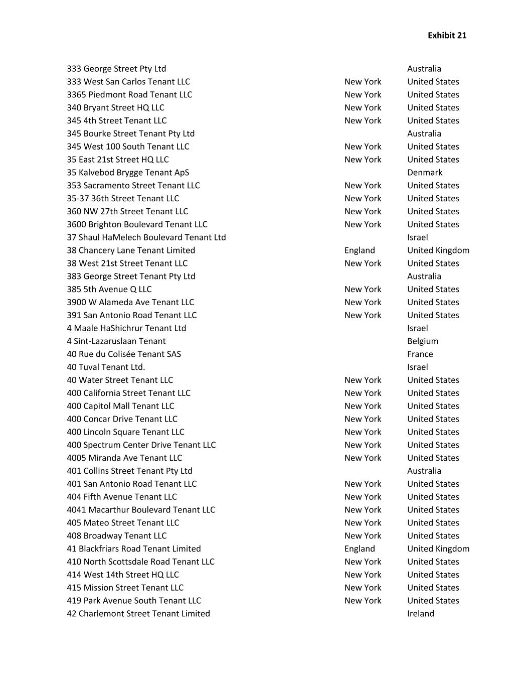 333 George Street Pty Ltd Australia 333 West San Carlos Tenant LLC New York United States 3365 Piedmont Road Tenant LLC New York United States 340 Bryant Street HQ LLC New York United States 345 4th Street Tenant LLC New York United States 345 Bourke Street Tenant Pty Ltd Australia 345 West 100 South Tenant LLC New York United States 35 East 21st Street HQ LLC New York United States 35 Kalvebod Brygge Tenant ApS Denmark 353 Sacramento Street Tenant LLC New York United States 35-37 36th Street Tenant LLC New York United States 360 NW 27th Street Tenant LLC New York United States 3600 Brighton Boulevard Tenant LLC New York United States 37 Shaul HaMelech Boulevard Tenant Ltd Israel 38 Chancery Lane Tenant Limited England United Kingdom 38 West 21st Street Tenant LLC New York United States 383 George Street Tenant Pty Ltd Australia 385 5th Avenue Q LLC New York United States 3900 W Alameda Ave Tenant LLC New York United States 391 San Antonio Road Tenant LLC New York United States 4 Maale HaShichrur Tenant Ltd Israel 4 Sint-Lazaruslaan Tenant Belgium 40 Rue du Colisée Tenant SAS France 40 Tuval Tenant Ltd. Israel 40 Water Street Tenant LLC New York United States 400 California Street Tenant LLC New York United States 400 Capitol Mall Tenant LLC New York United States 400 Concar Drive Tenant LLC New York United States 400 Lincoln Square Tenant LLC New York United States 400 Spectrum Center Drive Tenant LLC New York United States 4005 Miranda Ave Tenant LLC New York United States 401 Collins Street Tenant Pty Ltd Australia 401 San Antonio Road Tenant LLC New York United States 404 Fifth Avenue Tenant LLC New York United States 4041 Macarthur Boulevard Tenant LLC New York United States 405 Mateo Street Tenant LLC New York United States 408 Broadway Tenant LLC New York United States 41 Blackfriars Road Tenant Limited England United Kingdom 410 North Scottsdale Road Tenant LLC New York United States 414 West 14th Street HQ LLC New York United States 415 Mission Street Tenant LLC New York United States 419 Park Avenue South Tenant LLC New York United States 42 Charlemont Street Tenant Limited Ireland Exhibit 21