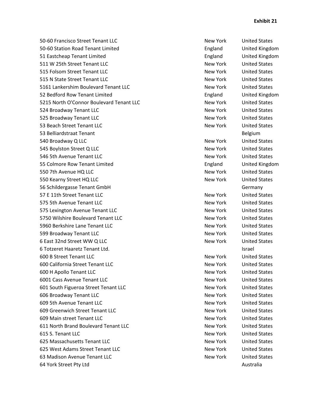 50-60 Francisco Street Tenant LLC New York United States 50-60 Station Road Tenant Limited England United Kingdom 51 Eastcheap Tenant Limited England United Kingdom 511 W 25th Street Tenant LLC New York United States 515 Folsom Street Tenant LLC New York United States 515 N State Street Tenant LLC New York United States 5161 Lankershim Boulevard Tenant LLC New York United States 52 Bedford Row Tenant Limited England United Kingdom 5215 North O'Connor Boulevard Tenant LLC New York United States 524 Broadway Tenant LLC New York United States 525 Broadway Tenant LLC New York United States 53 Beach Street Tenant LLC New York United States 53 Belliardstraat Tenant Belgium 540 Broadway Q LLC New York United States 545 Boylston Street Q LLC New York United States 546 5th Avenue Tenant LLC New York United States 55 Colmore Row Tenant Limited England United Kingdom 550 7th Avenue HQ LLC New York United States 550 Kearny Street HQ LLC New York United States 56 Schildergasse Tenant GmbH Germany 57 E 11th Street Tenant LLC New York United States 575 5th Avenue Tenant LLC New York United States 575 Lexington Avenue Tenant LLC New York United States 5750 Wilshire Boulevard Tenant LLC New York United States 5960 Berkshire Lane Tenant LLC New York United States 599 Broadway Tenant LLC New York United States 6 East 32nd Street WW Q LLC New York United States 6 Totzeret Haaretz Tenant Ltd. Israel 600 B Street Tenant LLC New York United States 600 California Street Tenant LLC New York United States 600 H Apollo Tenant LLC New York United States 6001 Cass Avenue Tenant LLC New York United States 601 South Figueroa Street Tenant LLC New York United States 606 Broadway Tenant LLC New York United States 609 5th Avenue Tenant LLC New York United States 609 Greenwich Street Tenant LLC New York United States 609 Main street Tenant LLC New York United States 611 North Brand Boulevard Tenant LLC New York United States 615 S. Tenant LLC New York United States 625 Massachusetts Tenant LLC New York United States 625 West Adams Street Tenant LLC New York United States 63 Madison Avenue Tenant LLC New York United States 64 York Street Pty Ltd Australia Exhibit 21