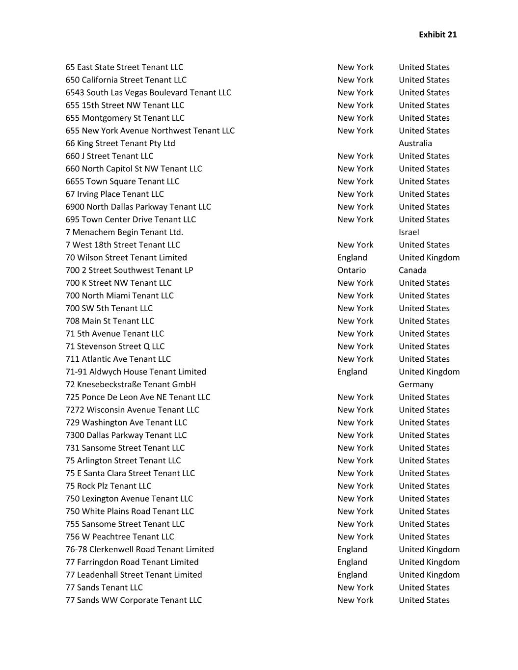 65 East State Street Tenant LLC New York United States 650 California Street Tenant LLC New York United States 6543 South Las Vegas Boulevard Tenant LLC New York United States 655 15th Street NW Tenant LLC New York United States 655 Montgomery St Tenant LLC New York United States 655 New York Avenue Northwest Tenant LLC New York United States 66 King Street Tenant Pty Ltd Australia 660 J Street Tenant LLC New York United States 660 North Capitol St NW Tenant LLC New York United States 6655 Town Square Tenant LLC New York United States 67 Irving Place Tenant LLC New York United States 6900 North Dallas Parkway Tenant LLC New York United States 695 Town Center Drive Tenant LLC New York United States 7 Menachem Begin Tenant Ltd. Israel 7 West 18th Street Tenant LLC New York United States 70 Wilson Street Tenant Limited England United Kingdom 700 2 Street Southwest Tenant LP Ontario Canada 700 K Street NW Tenant LLC New York United States 700 North Miami Tenant LLC New York United States 700 SW 5th Tenant LLC New York United States 708 Main St Tenant LLC New York United States 71 5th Avenue Tenant LLC New York United States 71 Stevenson Street Q LLC New York United States 711 Atlantic Ave Tenant LLC New York United States 71-91 Aldwych House Tenant Limited England United Kingdom 72 Knesebeckstraße Tenant GmbH Germany 725 Ponce De Leon Ave NE Tenant LLC New York United States 7272 Wisconsin Avenue Tenant LLC New York United States 729 Washington Ave Tenant LLC New York United States 7300 Dallas Parkway Tenant LLC New York United States 731 Sansome Street Tenant LLC New York United States 75 Arlington Street Tenant LLC New York United States 75 E Santa Clara Street Tenant LLC New York United States 75 Rock Plz Tenant LLC New York United States 750 Lexington Avenue Tenant LLC New York United States 750 White Plains Road Tenant LLC New York United States 755 Sansome Street Tenant LLC New York United States 756 W Peachtree Tenant LLC New York United States 76-78 Clerkenwell Road Tenant Limited England United Kingdom 77 Farringdon Road Tenant Limited England United Kingdom 77 Leadenhall Street Tenant Limited England United Kingdom 77 Sands Tenant LLC New York United States 77 Sands WW Corporate Tenant LLC New York United States Exhibit 21