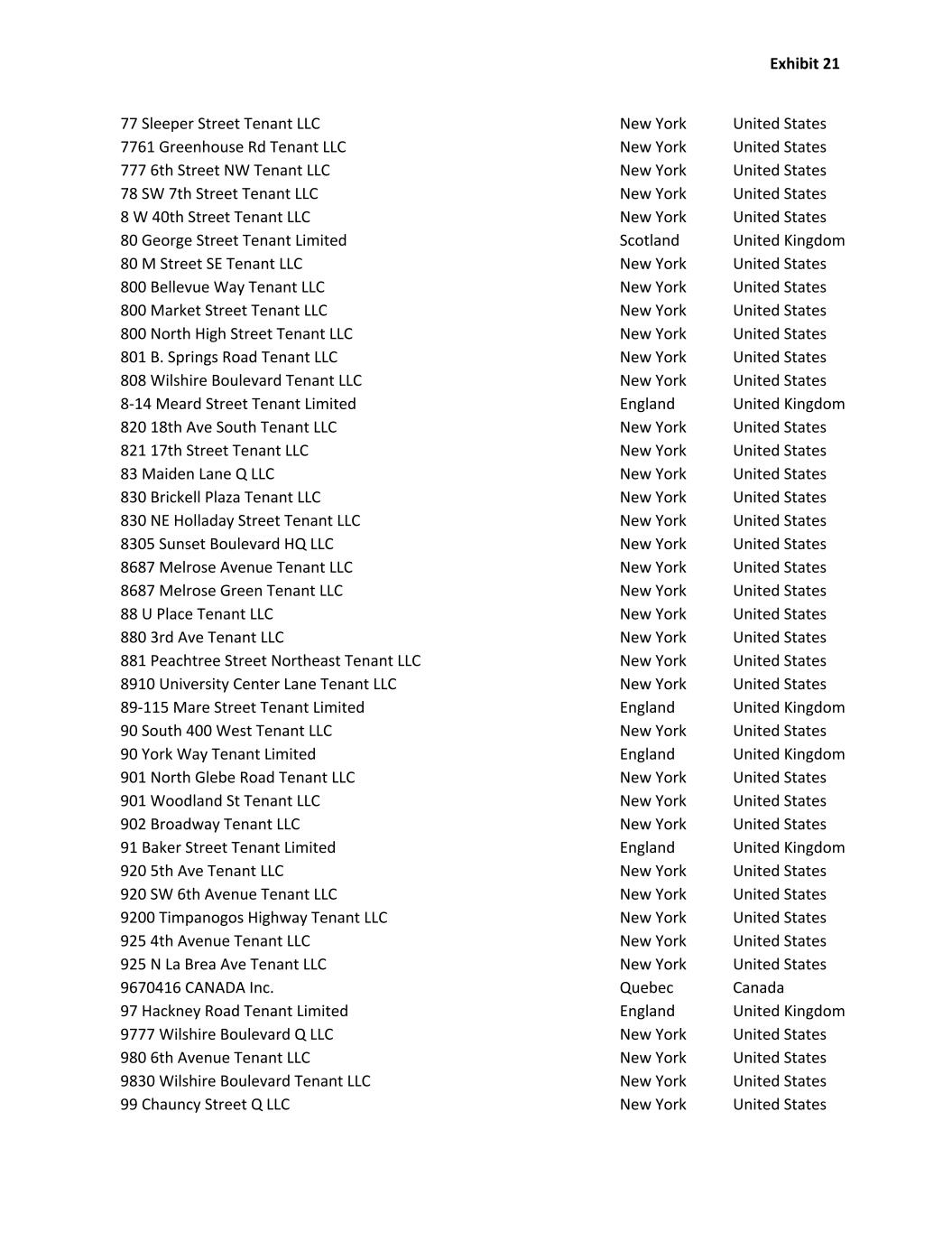 77 Sleeper Street Tenant LLC New York United States 7761 Greenhouse Rd Tenant LLC New York United States 777 6th Street NW Tenant LLC New York United States 78 SW 7th Street Tenant LLC New York United States 8 W 40th Street Tenant LLC New York United States 80 George Street Tenant Limited Scotland United Kingdom 80 M Street SE Tenant LLC New York United States 800 Bellevue Way Tenant LLC New York United States 800 Market Street Tenant LLC New York United States 800 North High Street Tenant LLC New York United States 801 B. Springs Road Tenant LLC New York United States 808 Wilshire Boulevard Tenant LLC New York United States 8-14 Meard Street Tenant Limited England United Kingdom 820 18th Ave South Tenant LLC New York United States 821 17th Street Tenant LLC New York United States 83 Maiden Lane Q LLC New York United States 830 Brickell Plaza Tenant LLC New York United States 830 NE Holladay Street Tenant LLC New York United States 8305 Sunset Boulevard HQ LLC New York United States 8687 Melrose Avenue Tenant LLC New York United States 8687 Melrose Green Tenant LLC New York United States 88 U Place Tenant LLC New York United States 880 3rd Ave Tenant LLC New York United States 881 Peachtree Street Northeast Tenant LLC New York United States 8910 University Center Lane Tenant LLC New York United States 89-115 Mare Street Tenant Limited England United Kingdom 90 South 400 West Tenant LLC New York United States 90 York Way Tenant Limited England United Kingdom 901 North Glebe Road Tenant LLC New York United States 901 Woodland St Tenant LLC New York United States 902 Broadway Tenant LLC New York United States 91 Baker Street Tenant Limited England United Kingdom 920 5th Ave Tenant LLC New York United States 920 SW 6th Avenue Tenant LLC New York United States 9200 Timpanogos Highway Tenant LLC New York United States 925 4th Avenue Tenant LLC New York United States 925 N La Brea Ave Tenant LLC New York United States 9670416 CANADA Inc. Quebec Canada 97 Hackney Road Tenant Limited England United Kingdom 9777 Wilshire Boulevard Q LLC New York United States 980 6th Avenue Tenant LLC New York United States 9830 Wilshire Boulevard Tenant LLC New York United States 99 Chauncy Street Q LLC New York United States Exhibit 21