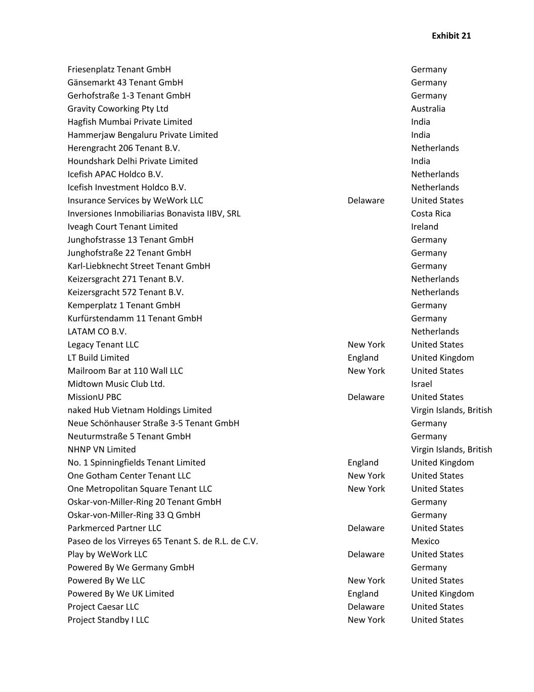Friesenplatz Tenant GmbH Germany Gänsemarkt 43 Tenant GmbH Germany Gerhofstraße 1-3 Tenant GmbH Germany Gravity Coworking Pty Ltd Australia Hagfish Mumbai Private Limited India Hammerjaw Bengaluru Private Limited India Herengracht 206 Tenant B.V. Netherlands Houndshark Delhi Private Limited India Icefish APAC Holdco B.V. Netherlands Icefish Investment Holdco B.V. Netherlands Insurance Services by WeWork LLC Delaware United States Inversiones Inmobiliarias Bonavista IIBV, SRL Costa Rica Iveagh Court Tenant Limited Ireland Junghofstrasse 13 Tenant GmbH Germany Junghofstraße 22 Tenant GmbH Germany Karl-Liebknecht Street Tenant GmbH Germany Keizersgracht 271 Tenant B.V. Netherlands Keizersgracht 572 Tenant B.V. Netherlands Kemperplatz 1 Tenant GmbH Germany Kurfürstendamm 11 Tenant GmbH Germany LATAM CO B.V. Netherlands Legacy Tenant LLC New York United States LT Build Limited England United Kingdom Mailroom Bar at 110 Wall LLC New York United States Midtown Music Club Ltd. Israel MissionU PBC Delaware United States naked Hub Vietnam Holdings Limited Virgin Islands, British Neue Schönhauser Straße 3-5 Tenant GmbH Germany Neuturmstraße 5 Tenant GmbH Germany NHNP VN Limited Virgin Islands, British No. 1 Spinningfields Tenant Limited England United Kingdom One Gotham Center Tenant LLC New York United States One Metropolitan Square Tenant LLC New York United States Oskar-von-Miller-Ring 20 Tenant GmbH Germany Oskar-von-Miller-Ring 33 Q GmbH Germany Parkmerced Partner LLC Delaware United States Paseo de los Virreyes 65 Tenant S. de R.L. de C.V. Mexico Play by WeWork LLC Delaware United States Powered By We Germany GmbH Germany Powered By We LLC New York United States Powered By We UK Limited England United Kingdom Project Caesar LLC Delaware United States Project Standby I LLC New York United States Exhibit 21