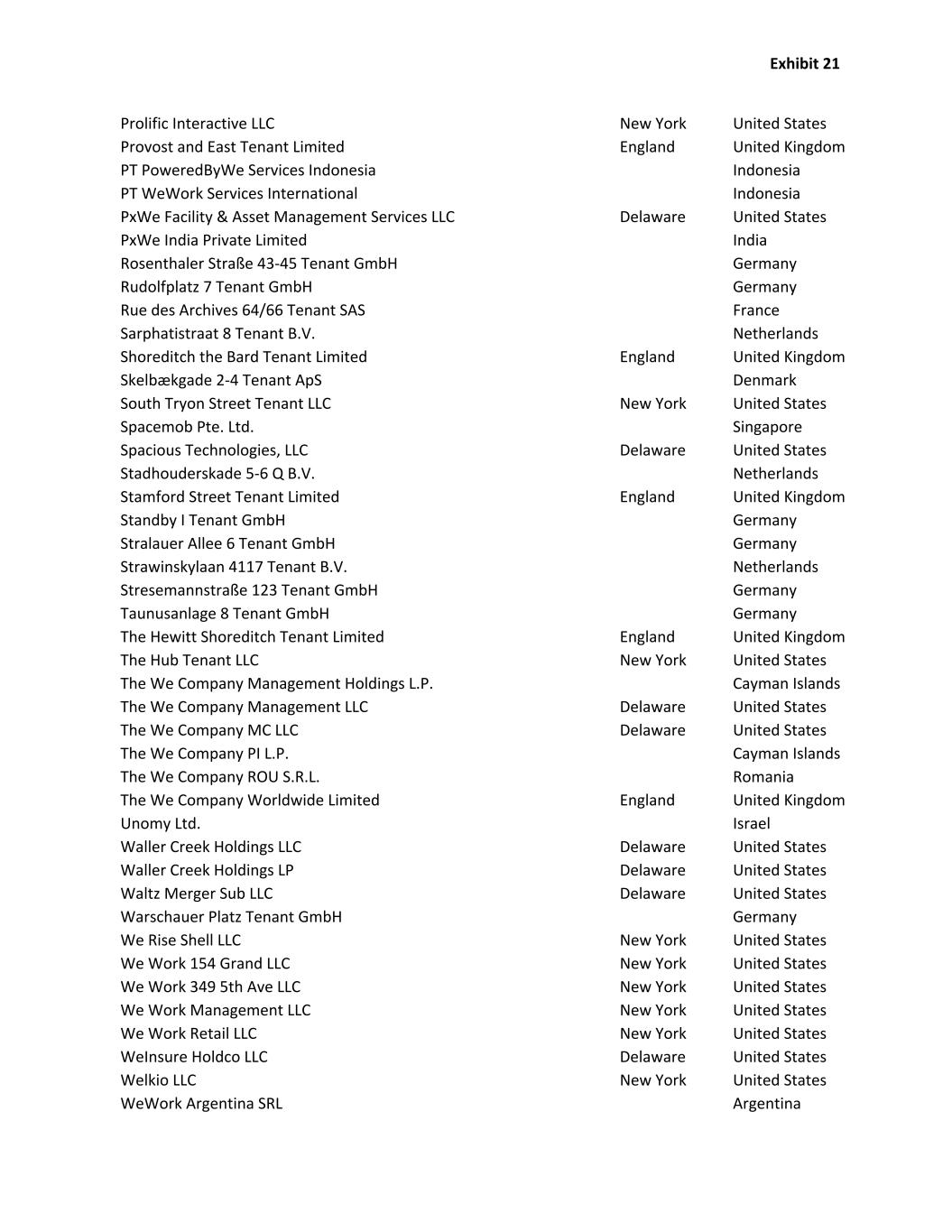 Prolific Interactive LLC New York United States Provost and East Tenant Limited England United Kingdom PT PoweredByWe Services Indonesia Indonesia PT WeWork Services International Indonesia PxWe Facility & Asset Management Services LLC Delaware United States PxWe India Private Limited India Rosenthaler Straße 43-45 Tenant GmbH Germany Rudolfplatz 7 Tenant GmbH Germany Rue des Archives 64/66 Tenant SAS France Sarphatistraat 8 Tenant B.V. Netherlands Shoreditch the Bard Tenant Limited England United Kingdom Skelbækgade 2-4 Tenant ApS Denmark South Tryon Street Tenant LLC New York United States Spacemob Pte. Ltd. Singapore Spacious Technologies, LLC Delaware United States Stadhouderskade 5-6 Q B.V. Netherlands Stamford Street Tenant Limited England United Kingdom Standby I Tenant GmbH Germany Stralauer Allee 6 Tenant GmbH Germany Strawinskylaan 4117 Tenant B.V. Netherlands Stresemannstraße 123 Tenant GmbH Germany Taunusanlage 8 Tenant GmbH Germany The Hewitt Shoreditch Tenant Limited England United Kingdom The Hub Tenant LLC New York United States The We Company Management Holdings L.P. Cayman Islands The We Company Management LLC Delaware United States The We Company MC LLC Delaware United States The We Company PI L.P. Cayman Islands The We Company ROU S.R.L. Romania The We Company Worldwide Limited England United Kingdom Unomy Ltd. Israel Waller Creek Holdings LLC Delaware United States Waller Creek Holdings LP Delaware United States Waltz Merger Sub LLC Delaware United States Warschauer Platz Tenant GmbH Germany We Rise Shell LLC New York United States We Work 154 Grand LLC New York United States We Work 349 5th Ave LLC New York United States We Work Management LLC New York United States We Work Retail LLC New York United States WeInsure Holdco LLC Delaware United States Welkio LLC New York United States WeWork Argentina SRL Argentina Exhibit 21