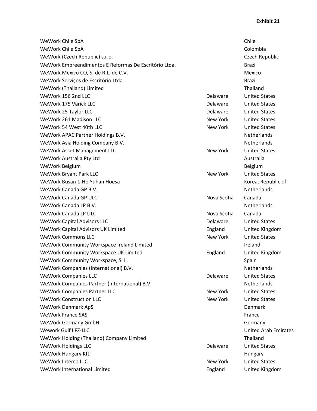 WeWork Chile SpA Chile WeWork Chile SpA Colombia WeWork (Czech Republic) s.r.o. Czech Republic WeWork Empreendimentos E Reformas De Escritório Ltda. Brazil WeWork Mexico CO, S. de R.L. de C.V. Mexico WeWork Serviços de Escritório Ltda Brazil WeWork (Thailand) Limited Thailand WeWork 156 2nd LLC Delaware United States WeWork 175 Varick LLC Delaware United States WeWork 25 Taylor LLC Delaware United States WeWork 261 Madison LLC New York United States WeWork 54 West 40th LLC New York United States WeWork APAC Partner Holdings B.V. Netherlands WeWork Asia Holding Company B.V. Netherlands WeWork Asset Management LLC New York United States WeWork Australia Pty Ltd Australia WeWork Belgium Belgium WeWork Bryant Park LLC New York United States WeWork Busan 1-Ho Yuhan Hoesa Korea, Republic of WeWork Canada GP B.V. Netherlands WeWork Canada GP ULC Nova Scotia Canada WeWork Canada LP B.V. Netherlands WeWork Canada LP ULC Nova Scotia Canada WeWork Capital Advisors LLC Delaware United States WeWork Capital Advisors UK Limited England United Kingdom WeWork Commons LLC New York United States WeWork Community Workspace Ireland Limited Ireland WeWork Community Workspace UK Limited England United Kingdom WeWork Community Workspace, S. L. Spain WeWork Companies (International) B.V. Netherlands WeWork Companies LLC Delaware United States WeWork Companies Partner (International) B.V. Netherlands WeWork Companies Partner LLC New York United States WeWork Construction LLC New York United States WeWork Denmark ApS Denmark WeWork France SAS France WeWork Germany GmbH Germany Wework Gulf I FZ-LLC United Arab Emirates WeWork Holding (Thailand) Company Limited Thailand WeWork Holdings LLC Delaware United States WeWork Hungary Kft. Hungary WeWork Interco LLC New York United States WeWork International Limited England United Kingdom Exhibit 21