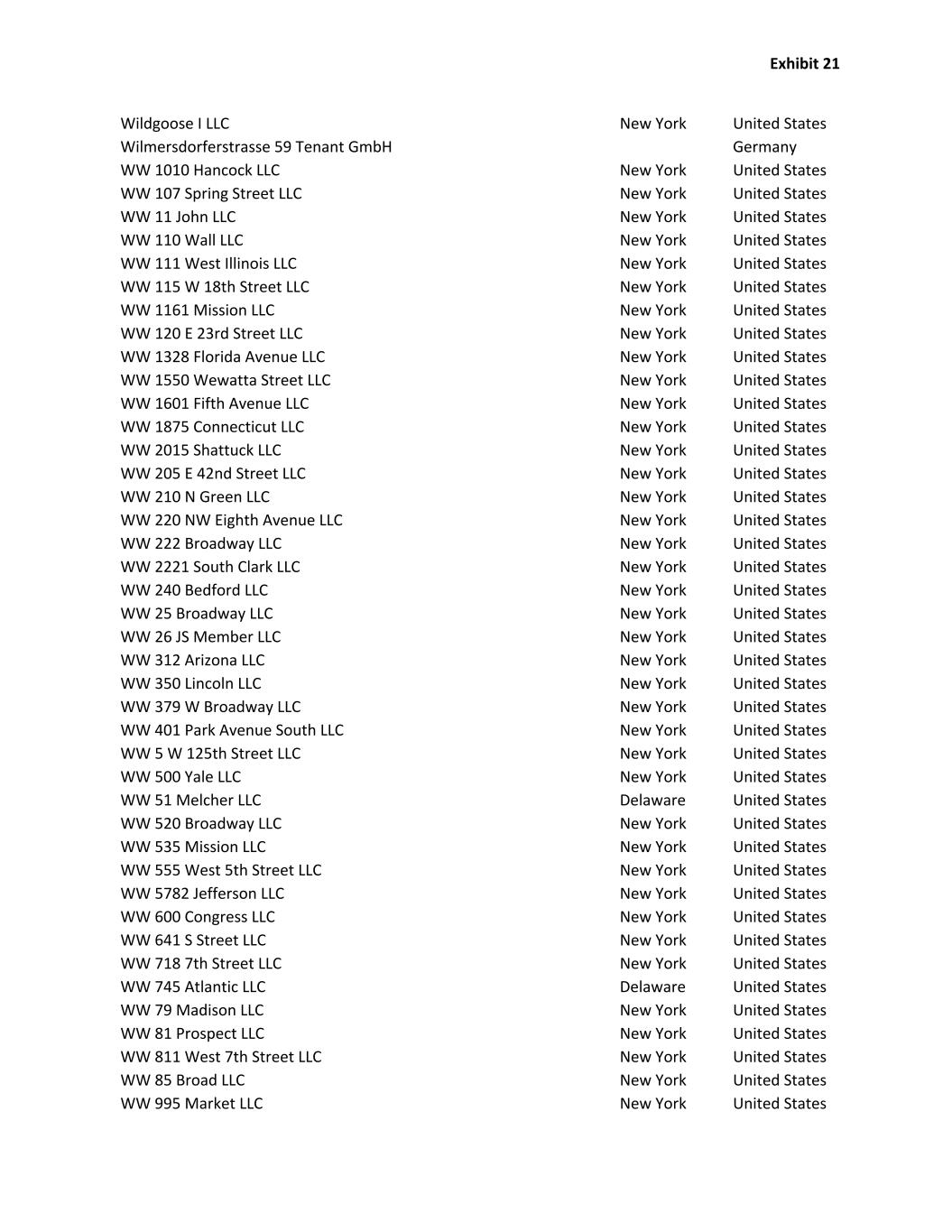 Wildgoose I LLC New York United States Wilmersdorferstrasse 59 Tenant GmbH Germany WW 1010 Hancock LLC New York United States WW 107 Spring Street LLC New York United States WW 11 John LLC New York United States WW 110 Wall LLC New York United States WW 111 West Illinois LLC New York United States WW 115 W 18th Street LLC New York United States WW 1161 Mission LLC New York United States WW 120 E 23rd Street LLC New York United States WW 1328 Florida Avenue LLC New York United States WW 1550 Wewatta Street LLC New York United States WW 1601 Fifth Avenue LLC New York United States WW 1875 Connecticut LLC New York United States WW 2015 Shattuck LLC New York United States WW 205 E 42nd Street LLC New York United States WW 210 N Green LLC New York United States WW 220 NW Eighth Avenue LLC New York United States WW 222 Broadway LLC New York United States WW 2221 South Clark LLC New York United States WW 240 Bedford LLC New York United States WW 25 Broadway LLC New York United States WW 26 JS Member LLC New York United States WW 312 Arizona LLC New York United States WW 350 Lincoln LLC New York United States WW 379 W Broadway LLC New York United States WW 401 Park Avenue South LLC New York United States WW 5 W 125th Street LLC New York United States WW 500 Yale LLC New York United States WW 51 Melcher LLC Delaware United States WW 520 Broadway LLC New York United States WW 535 Mission LLC New York United States WW 555 West 5th Street LLC New York United States WW 5782 Jefferson LLC New York United States WW 600 Congress LLC New York United States WW 641 S Street LLC New York United States WW 718 7th Street LLC New York United States WW 745 Atlantic LLC Delaware United States WW 79 Madison LLC New York United States WW 81 Prospect LLC New York United States WW 811 West 7th Street LLC New York United States WW 85 Broad LLC New York United States WW 995 Market LLC New York United States Exhibit 21
