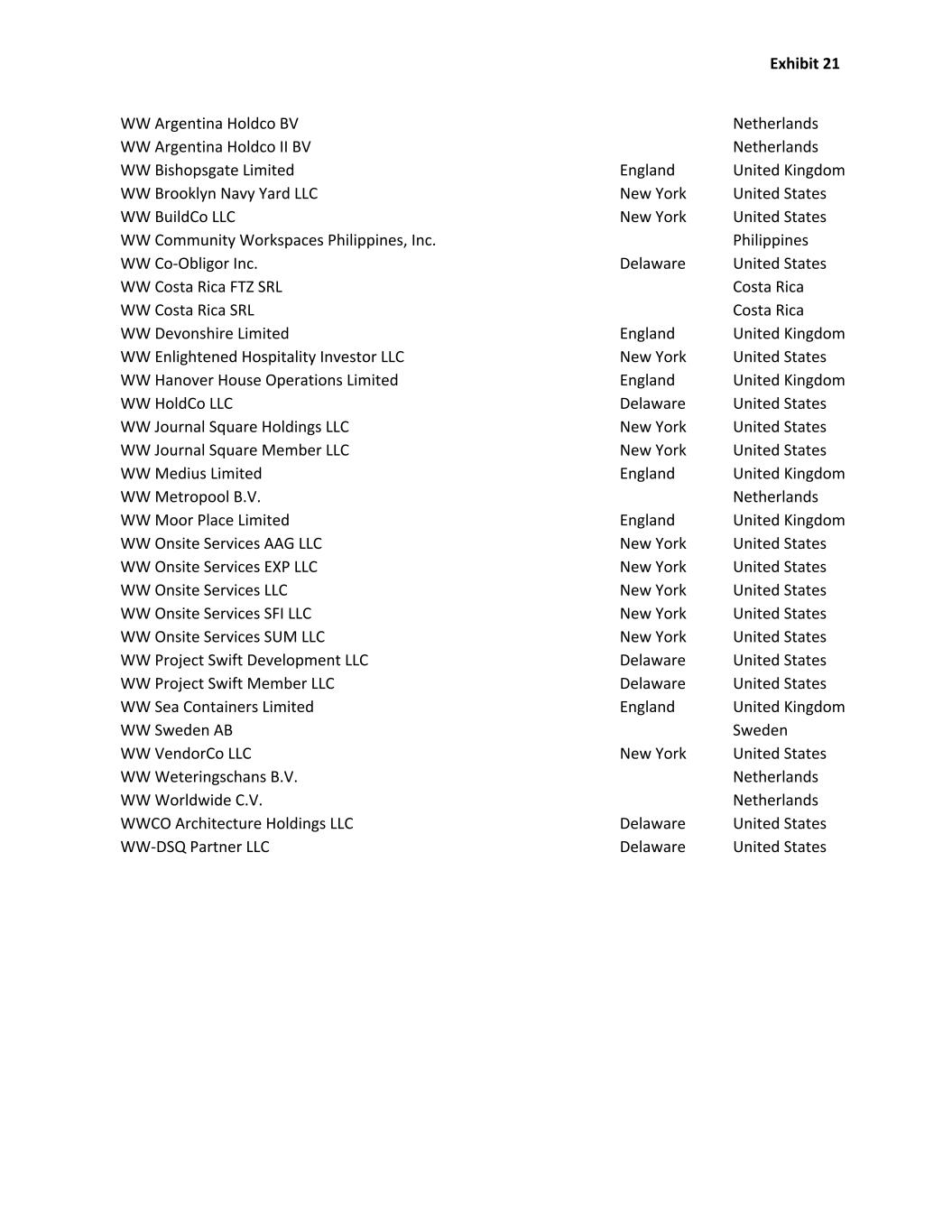 WW Argentina Holdco BV Netherlands WW Argentina Holdco II BV Netherlands WW Bishopsgate Limited England United Kingdom WW Brooklyn Navy Yard LLC New York United States WW BuildCo LLC New York United States WW Community Workspaces Philippines, Inc. Philippines WW Co-Obligor Inc. Delaware United States WW Costa Rica FTZ SRL Costa Rica WW Costa Rica SRL Costa Rica WW Devonshire Limited England United Kingdom WW Enlightened Hospitality Investor LLC New York United States WW Hanover House Operations Limited England United Kingdom WW HoldCo LLC Delaware United States WW Journal Square Holdings LLC New York United States WW Journal Square Member LLC New York United States WW Medius Limited England United Kingdom WW Metropool B.V. Netherlands WW Moor Place Limited England United Kingdom WW Onsite Services AAG LLC New York United States WW Onsite Services EXP LLC New York United States WW Onsite Services LLC New York United States WW Onsite Services SFI LLC New York United States WW Onsite Services SUM LLC New York United States WW Project Swift Development LLC Delaware United States WW Project Swift Member LLC Delaware United States WW Sea Containers Limited England United Kingdom WW Sweden AB Sweden WW VendorCo LLC New York United States WW Weteringschans B.V. Netherlands WW Worldwide C.V. Netherlands WWCO Architecture Holdings LLC Delaware United States WW-DSQ Partner LLC Delaware United States Exhibit 21