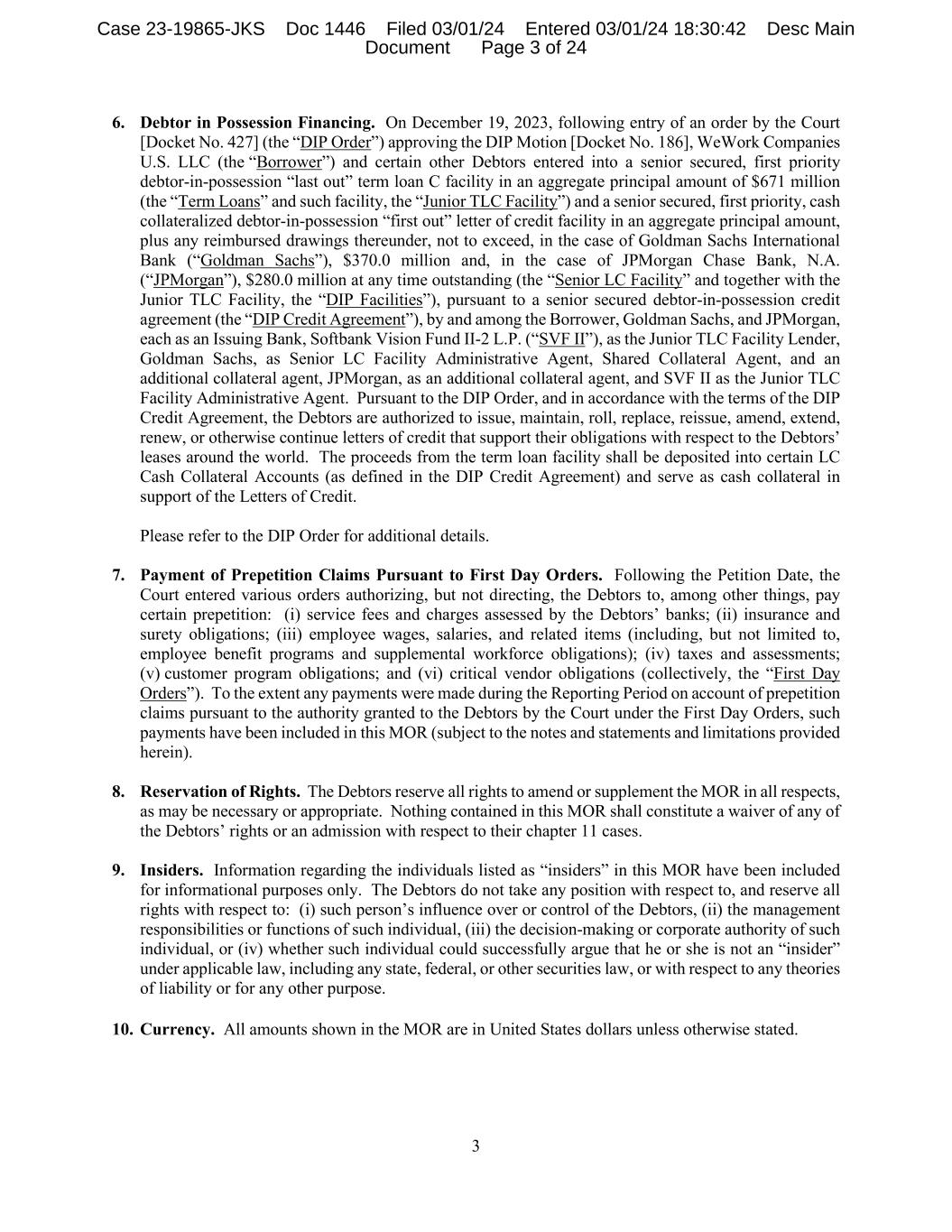 3 6. Debtor in Possession Financing. On December 19, 2023, following entry of an order by the Court [Docket No. 427] (the “DIP Order”) approving the DIP Motion [Docket No. 186], WeWork Companies U.S. LLC (the “Borrower”) and certain other Debtors entered into a senior secured, first priority debtor-in-possession “last out” term loan C facility in an aggregate principal amount of $671 million (the “Term Loans” and such facility, the “Junior TLC Facility”) and a senior secured, first priority, cash collateralized debtor-in-possession “first out” letter of credit facility in an aggregate principal amount, plus any reimbursed drawings thereunder, not to exceed, in the case of Goldman Sachs International Bank (“Goldman Sachs”), $370.0 million and, in the case of JPMorgan Chase Bank, N.A. (“JPMorgan”), $280.0 million at any time outstanding (the “Senior LC Facility” and together with the Junior TLC Facility, the “DIP Facilities”), pursuant to a senior secured debtor-in-possession credit agreement (the “DIP Credit Agreement”), by and among the Borrower, Goldman Sachs, and JPMorgan, each as an Issuing Bank, Softbank Vision Fund II-2 L.P. (“SVF II”), as the Junior TLC Facility Lender, Goldman Sachs, as Senior LC Facility Administrative Agent, Shared Collateral Agent, and an additional collateral agent, JPMorgan, as an additional collateral agent, and SVF II as the Junior TLC Facility Administrative Agent. Pursuant to the DIP Order, and in accordance with the terms of the DIP Credit Agreement, the Debtors are authorized to issue, maintain, roll, replace, reissue, amend, extend, renew, or otherwise continue letters of credit that support their obligations with respect to the Debtors’ leases around the world. The proceeds from the term loan facility shall be deposited into certain LC Cash Collateral Accounts (as defined in the DIP Credit Agreement) and serve as cash collateral in support of the Letters of Credit. Please refer to the DIP Order for additional details. 7. Payment of Prepetition Claims Pursuant to First Day Orders. Following the Petition Date, the Court entered various orders authorizing, but not directing, the Debtors to, among other things, pay certain prepetition: (i) service fees and charges assessed by the Debtors’ banks; (ii) insurance and surety obligations; (iii) employee wages, salaries, and related items (including, but not limited to, employee benefit programs and supplemental workforce obligations); (iv) taxes and assessments; (v) customer program obligations; and (vi) critical vendor obligations (collectively, the “First Day Orders”). To the extent any payments were made during the Reporting Period on account of prepetition claims pursuant to the authority granted to the Debtors by the Court under the First Day Orders, such payments have been included in this MOR (subject to the notes and statements and limitations provided herein). 8. Reservation of Rights. The Debtors reserve all rights to amend or supplement the MOR in all respects, as may be necessary or appropriate. Nothing contained in this MOR shall constitute a waiver of any of the Debtors’ rights or an admission with respect to their chapter 11 cases. 9. Insiders. Information regarding the individuals listed as “insiders” in this MOR have been included for informational purposes only. The Debtors do not take any position with respect to, and reserve all rights with respect to: (i) such person’s influence over or control of the Debtors, (ii) the management responsibilities or functions of such individual, (iii) the decision-making or corporate authority of such individual, or (iv) whether such individual could successfully argue that he or she is not an “insider” under applicable law, including any state, federal, or other securities law, or with respect to any theories of liability or for any other purpose. 10. Currency. All amounts shown in the MOR are in United States dollars unless otherwise stated. Case 23-19865-JKS Doc 1446 Filed 03/01/24 Entered 03/01/24 18:30:42 Desc Main Document Page 3 of 24
