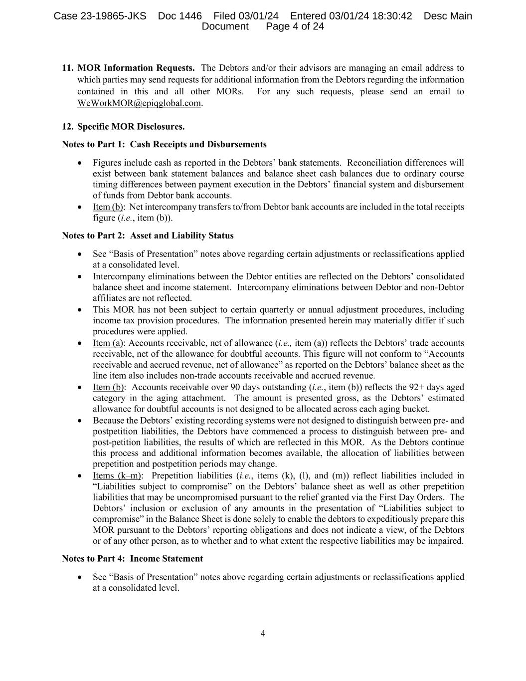 4 11. MOR Information Requests. The Debtors and/or their advisors are managing an email address to which parties may send requests for additional information from the Debtors regarding the information contained in this and all other MORs. For any such requests, please send an email to WeWorkMOR@epiqglobal.com. 12. Specific MOR Disclosures. Notes to Part 1: Cash Receipts and Disbursements • Figures include cash as reported in the Debtors’ bank statements. Reconciliation differences will exist between bank statement balances and balance sheet cash balances due to ordinary course timing differences between payment execution in the Debtors’ financial system and disbursement of funds from Debtor bank accounts. • Item (b): Net intercompany transfers to/from Debtor bank accounts are included in the total receipts figure (i.e., item (b)). Notes to Part 2: Asset and Liability Status • See “Basis of Presentation” notes above regarding certain adjustments or reclassifications applied at a consolidated level. • Intercompany eliminations between the Debtor entities are reflected on the Debtors’ consolidated balance sheet and income statement. Intercompany eliminations between Debtor and non-Debtor affiliates are not reflected. • This MOR has not been subject to certain quarterly or annual adjustment procedures, including income tax provision procedures. The information presented herein may materially differ if such procedures were applied. • Item (a): Accounts receivable, net of allowance (i.e., item (a)) reflects the Debtors’ trade accounts receivable, net of the allowance for doubtful accounts. This figure will not conform to “Accounts receivable and accrued revenue, net of allowance” as reported on the Debtors’ balance sheet as the line item also includes non-trade accounts receivable and accrued revenue. • Item (b): Accounts receivable over 90 days outstanding (i.e., item (b)) reflects the 92+ days aged category in the aging attachment. The amount is presented gross, as the Debtors’ estimated allowance for doubtful accounts is not designed to be allocated across each aging bucket. • Because the Debtors’ existing recording systems were not designed to distinguish between pre- and postpetition liabilities, the Debtors have commenced a process to distinguish between pre- and post-petition liabilities, the results of which are reflected in this MOR. As the Debtors continue this process and additional information becomes available, the allocation of liabilities between prepetition and postpetition periods may change. • Items (k–m): Prepetition liabilities (i.e., items (k), (l), and (m)) reflect liabilities included in “Liabilities subject to compromise” on the Debtors’ balance sheet as well as other prepetition liabilities that may be uncompromised pursuant to the relief granted via the First Day Orders. The Debtors’ inclusion or exclusion of any amounts in the presentation of “Liabilities subject to compromise” in the Balance Sheet is done solely to enable the debtors to expeditiously prepare this MOR pursuant to the Debtors’ reporting obligations and does not indicate a view, of the Debtors or of any other person, as to whether and to what extent the respective liabilities may be impaired. Notes to Part 4: Income Statement • See “Basis of Presentation” notes above regarding certain adjustments or reclassifications applied at a consolidated level. Case 23-19865-JKS Doc 1446 Filed 03/01/24 Entered 03/01/24 18:30:42 Desc Main Document Page 4 of 24