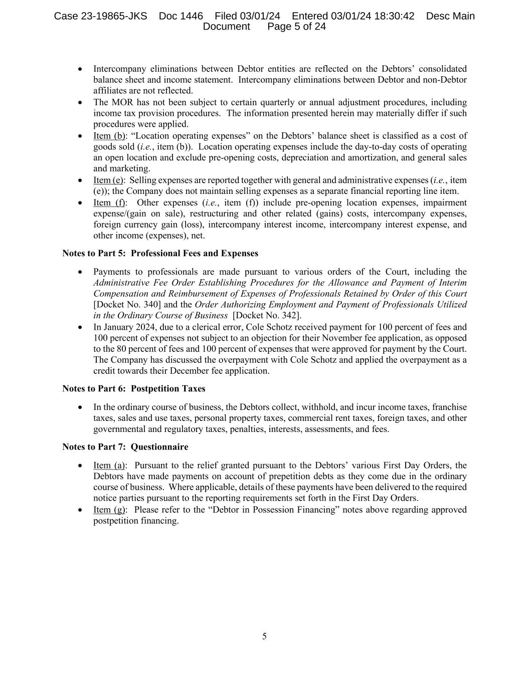 5 • Intercompany eliminations between Debtor entities are reflected on the Debtors’ consolidated balance sheet and income statement. Intercompany eliminations between Debtor and non-Debtor affiliates are not reflected. • The MOR has not been subject to certain quarterly or annual adjustment procedures, including income tax provision procedures. The information presented herein may materially differ if such procedures were applied. • Item (b): “Location operating expenses” on the Debtors’ balance sheet is classified as a cost of goods sold (i.e., item (b)). Location operating expenses include the day-to-day costs of operating an open location and exclude pre-opening costs, depreciation and amortization, and general sales and marketing. • Item (e): Selling expenses are reported together with general and administrative expenses (i.e., item (e)); the Company does not maintain selling expenses as a separate financial reporting line item. • Item (f): Other expenses (i.e., item (f)) include pre-opening location expenses, impairment expense/(gain on sale), restructuring and other related (gains) costs, intercompany expenses, foreign currency gain (loss), intercompany interest income, intercompany interest expense, and other income (expenses), net. Notes to Part 5: Professional Fees and Expenses • Payments to professionals are made pursuant to various orders of the Court, including the Administrative Fee Order Establishing Procedures for the Allowance and Payment of Interim Compensation and Reimbursement of Expenses of Professionals Retained by Order of this Court [Docket No. 340] and the Order Authorizing Employment and Payment of Professionals Utilized in the Ordinary Course of Business [Docket No. 342]. • In January 2024, due to a clerical error, Cole Schotz received payment for 100 percent of fees and 100 percent of expenses not subject to an objection for their November fee application, as opposed to the 80 percent of fees and 100 percent of expenses that were approved for payment by the Court. The Company has discussed the overpayment with Cole Schotz and applied the overpayment as a credit towards their December fee application. Notes to Part 6: Postpetition Taxes • In the ordinary course of business, the Debtors collect, withhold, and incur income taxes, franchise taxes, sales and use taxes, personal property taxes, commercial rent taxes, foreign taxes, and other governmental and regulatory taxes, penalties, interests, assessments, and fees. Notes to Part 7: Questionnaire • Item (a): Pursuant to the relief granted pursuant to the Debtors’ various First Day Orders, the Debtors have made payments on account of prepetition debts as they come due in the ordinary course of business. Where applicable, details of these payments have been delivered to the required notice parties pursuant to the reporting requirements set forth in the First Day Orders. • Item (g): Please refer to the “Debtor in Possession Financing” notes above regarding approved postpetition financing. Case 23-19865-JKS Doc 1446 Filed 03/01/24 Entered 03/01/24 18:30:42 Desc Main Document Page 5 of 24