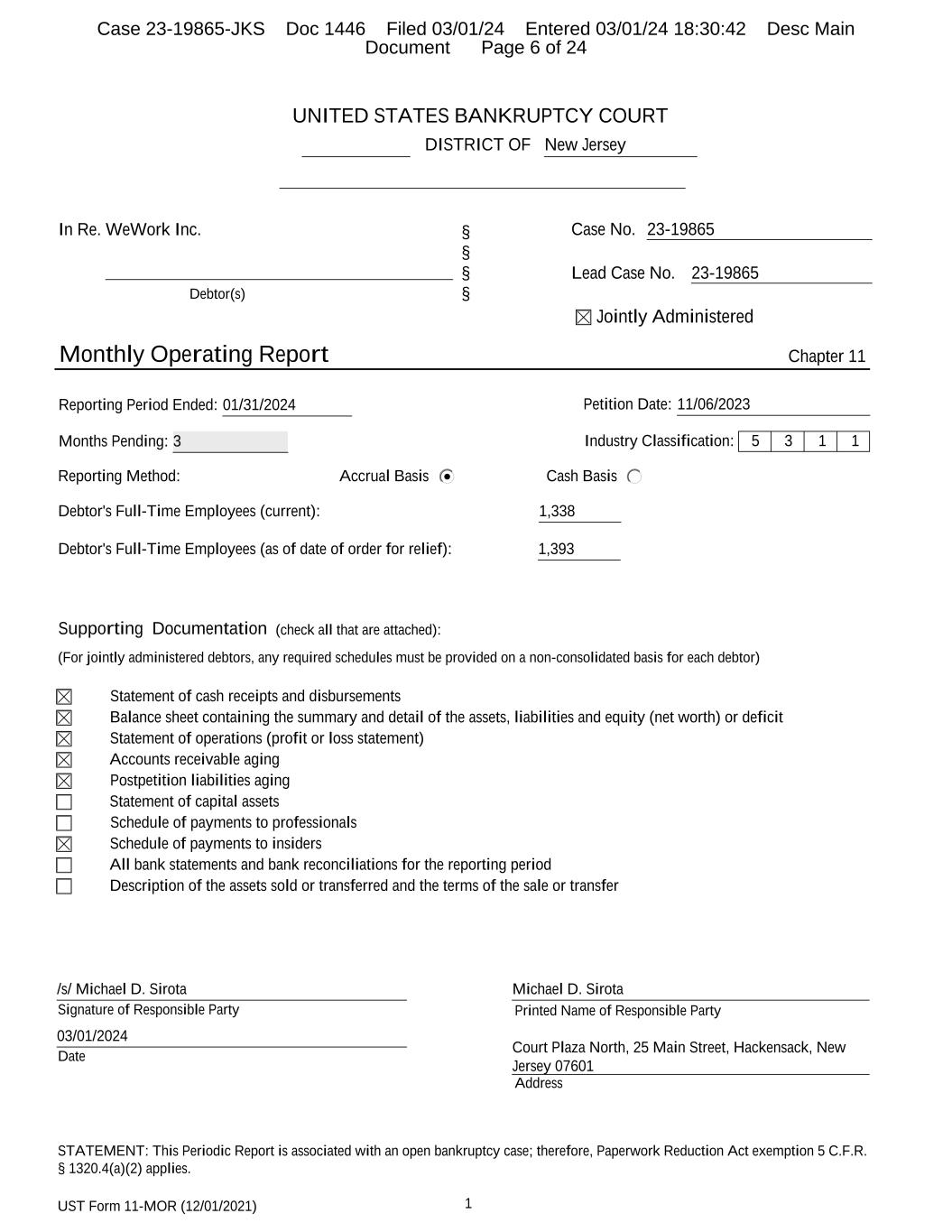UST Form 11-MOR (12/01/2021) 1 UNITED STATES BANKRUPTCY COURT DISTRICT OF New Jersey In Re. WeWork Inc. Debtor(s) § § § § Case No. 23-19865 Lead Case No. 23-19865 Jointly Administered Monthly Operating Report Chapter 11 Reporting Period Ended: 01/31/2024 Petition Date: 11/06/2023 Months Pending: 3 Industry Classification: 5 3 1 1 Reporting Method: Accrual Basis Cash Basis Debtor's Full-Time Employees (current): 1,338 Debtor's Full-Time Employees (as of date of order for relief): 1,393 Supporting Documentation (check all that are attached): (For jointly administered debtors, any required schedules must be provided on a non-consolidated basis for each debtor) Statement of cash receipts and disbursements Balance sheet containing the summary and detail of the assets, liabilities and equity (net worth) or deficit Statement of operations (profit or loss statement) Accounts receivable aging Postpetition liabilities aging Statement of capital assets Schedule of payments to professionals Schedule of payments to insiders All bank statements and bank reconciliations for the reporting period Description of the assets sold or transferred and the terms of the sale or transfer Signature of Responsible Party Printed Name of Responsible Party Date Address /s/ Michael D. Sirota 03/01/2024 Michael D. Sirota Court Plaza North, 25 Main Street, Hackensack, New Jersey 07601 STATEMENT: This Periodic Report is associated with an open bankruptcy case; therefore, Paperwork Reduction Act exemption 5 C.F.R. § 1320.4(a)(2) applies. Case 23-19865-JKS Doc 1446 Filed 03/01/24 Entered 03/01/24 18:30:42 Desc Main Document Page 6 of 24