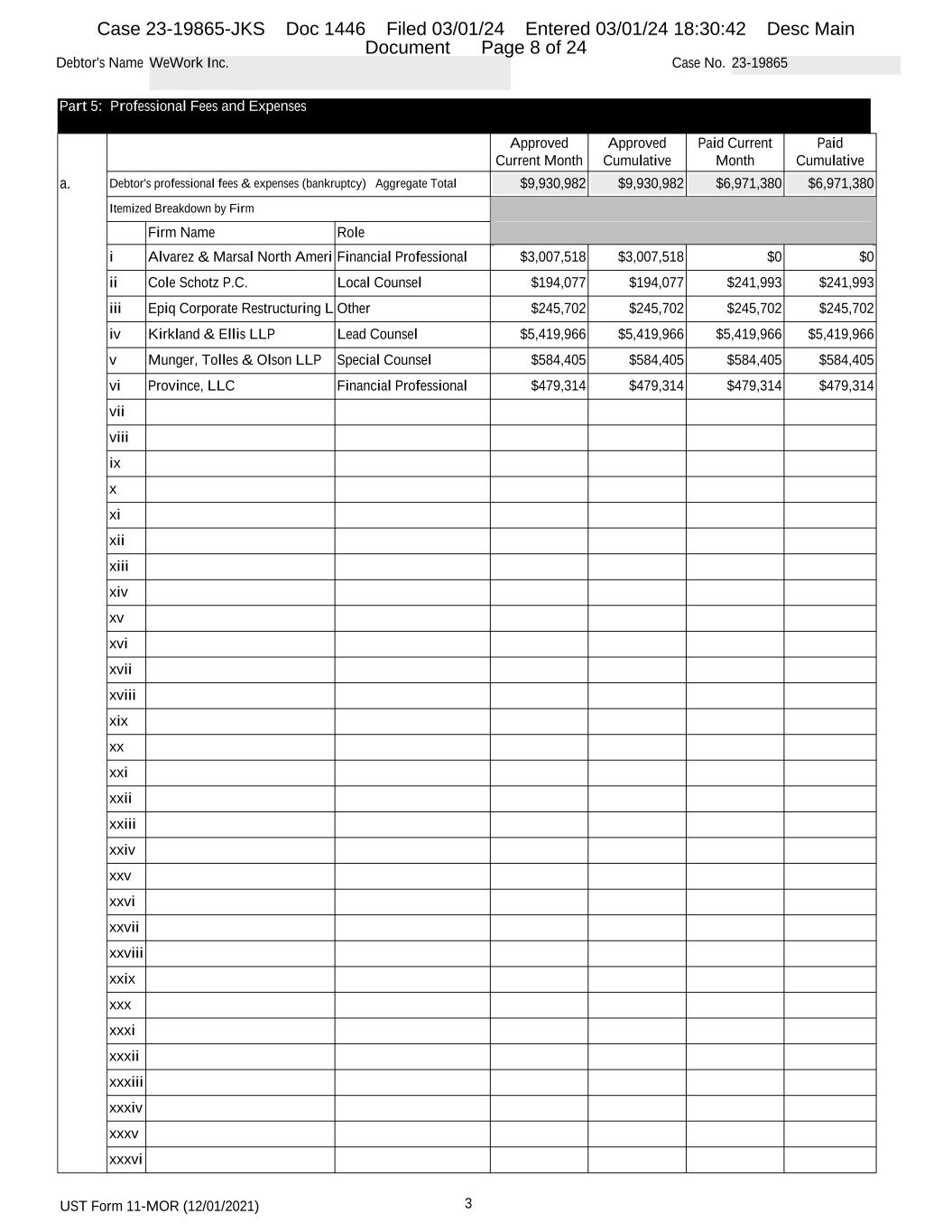 UST Form 11-MOR (12/01/2021) 3 Debtor's Name WeWork Inc. Case No. 23-19865 Part 5: Professional Fees and Expenses Approved Current Month Approved Cumulative Paid Current Month Paid Cumulative a. Debtor's professional fees & expenses (bankruptcy) Aggregate Total $9,930,982 $9,930,982 $6,971,380 $6,971,380 Itemized Breakdown by Firm Firm Name Role i Alvarez & Marsal North Ameri Financial Professional $3,007,518 $3,007,518 $0 $0 ii Cole Schotz P.C. Local Counsel $194,077 $194,077 $241,993 $241,993 iii Epiq Corporate Restructuring L Other $245,702 $245,702 $245,702 $245,702 iv Kirkland & Ellis LLP Lead Counsel $5,419,966 $5,419,966 $5,419,966 $5,419,966 v Munger, Tolles & Olson LLP Special Counsel $584,405 $584,405 $584,405 $584,405 vi Province, LLC Financial Professional $479,314 $479,314 $479,314 $479,314 vii viii ix x xi xii xiii xiv xv xvi xvii xviii xix xx xxi xxii xxiii xxiv xxv xxvi xxvii xxviii xxix xxx xxxi xxxii xxxiii xxxiv xxxv xxxvi Case 23-19865-JKS Doc 1446 Filed 03/01/24 Entered 03/01/24 18:30:42 Desc Main Document Page 8 of 24