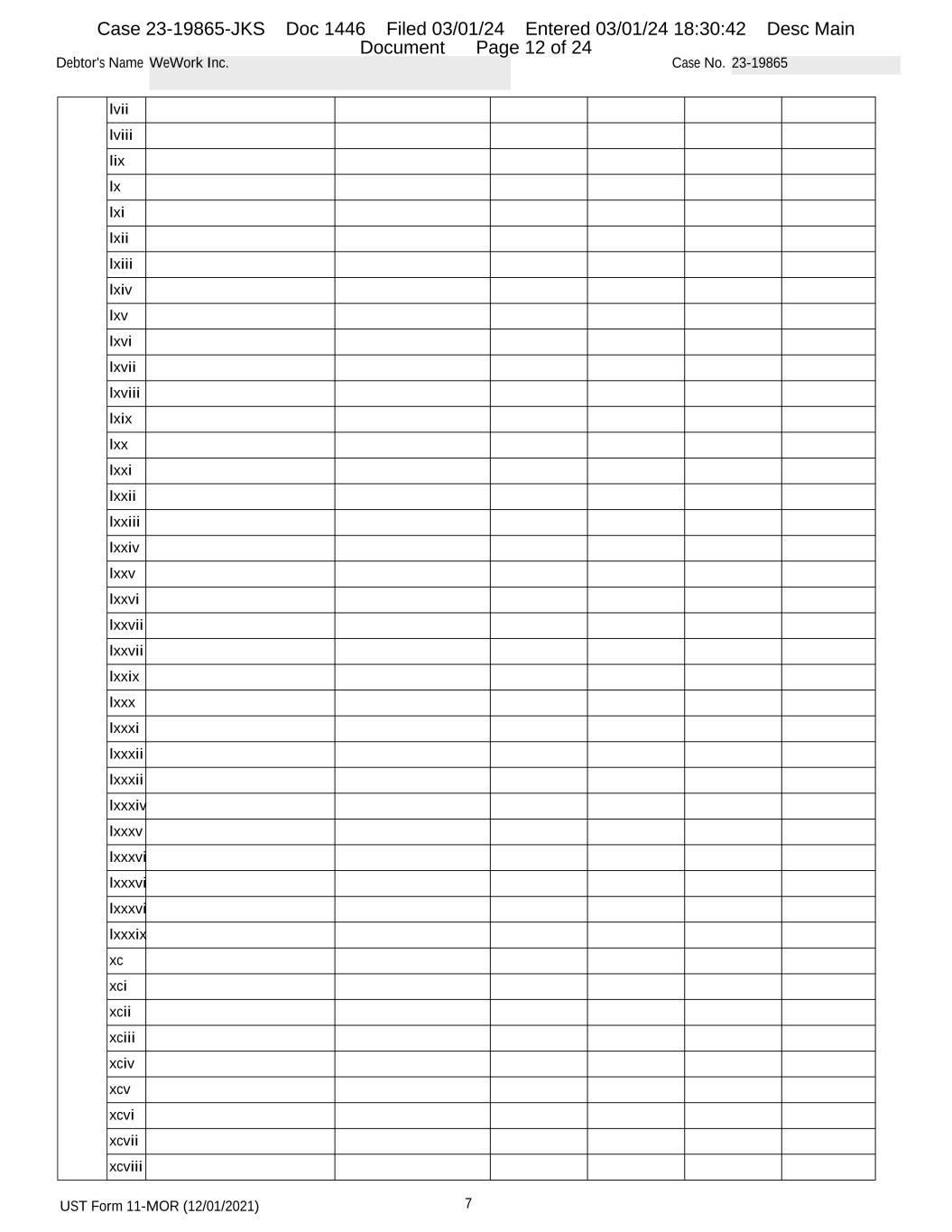 UST Form 11-MOR (12/01/2021) 7 Debtor's Name WeWork Inc. Case No. 23-19865 lvii lviii lix lx lxi lxii lxiii lxiv lxv lxvi lxvii lxviii lxix lxx lxxi lxxii lxxiii lxxiv lxxv lxxvi lxxvii lxxvii lxxix lxxx lxxxi lxxxii lxxxii lxxxiv lxxxv lxxxvi lxxxvi lxxxvi lxxxix xc xci xcii xciii xciv xcv xcvi xcvii xcviii Case 23-19865-JKS Doc 1446 Filed 03/01/24 Entered 03/01/24 18:30:42 Desc Main Document Page 12 of 24