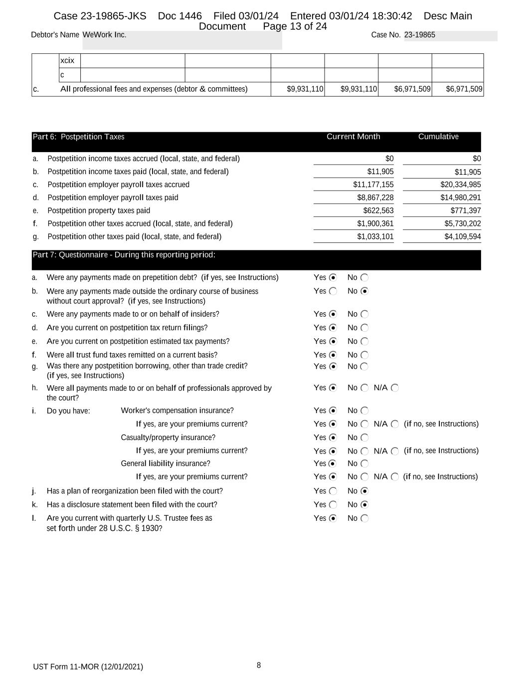UST Form 11-MOR (12/01/2021) 8 Debtor's Name WeWork Inc. Case No. 23-19865 xcix c c. All professional fees and expenses (debtor & committees) $9,931,110 $9,931,110 $6,971,509 $6,971,509 Part 6: Postpetition Taxes Current Month Cumulative a. Postpetition income taxes accrued (local, state, and federal) $0 $0 b. Postpetition income taxes paid (local, state, and federal) $11,905 $11,905 c. Postpetition employer payroll taxes accrued $11,177,155 $20,334,985 d. Postpetition employer payroll taxes paid $8,867,228 $14,980,291 e. Postpetition property taxes paid $622,563 $771,397 f. Postpetition other taxes accrued (local, state, and federal) $1,900,361 $5,730,202 g. Postpetition other taxes paid (local, state, and federal) $1,033,101 $4,109,594 Part 7: Questionnaire - During this reporting period: a. Were any payments made on prepetition debt? (if yes, see Instructions) Yes No b. Yes NoWere any payments made outside the ordinary course of business without court approval? (if yes, see Instructions) c. Yes NoWere any payments made to or on behalf of insiders? d. Yes NoAre you current on postpetition tax return filings? e. Yes NoAre you current on postpetition estimated tax payments? f. Were all trust fund taxes remitted on a current basis? Yes No g. Yes NoWas there any postpetition borrowing, other than trade credit? (if yes, see Instructions) h. Were all payments made to or on behalf of professionals approved by the court? Yes No N/A i. Do you have: Worker's compensation insurance? Yes No If yes, are your premiums current? Yes No N/A (if no, see Instructions) Casualty/property insurance? Yes No If yes, are your premiums current? Yes No N/A (if no, see Instructions) General liability insurance? Yes No If yes, are your premiums current? Yes No N/A (if no, see Instructions) j. Has a plan of reorganization been filed with the court? Yes No k. Has a disclosure statement been filed with the court? Yes No l. Are you current with quarterly U.S. Trustee fees as set forth under 28 U.S.C. § 1930? Yes No Case 23-19865-JKS Doc 1446 Filed 03/01/24 Entered 03/01/24 18:30:42 Desc Main Document Page 13 of 24
