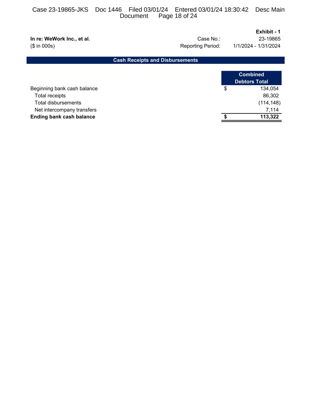 Exhibit - 1 In re: WeWork Inc., et al. Case No.: 23-19865 ($ in 000s) Reporting Period: 1/1/2024 - 1/31/2024 Cash Receipts and Disbursements Combined Debtors Total Beginning bank cash balance 134,054$ Total receipts 86,302 Total disbursements (114,148) Net intercompany transfers 7,114 Ending bank cash balance 113,322$ Case 23-19865-JKS Doc 1446 Filed 03/01/24 Entered 03/01/24 18:30:42 Desc Main Document Page 18 of 24