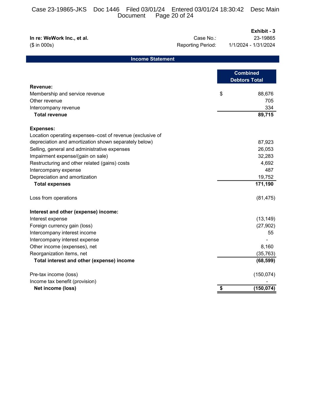 Exhibit - 3 In re: WeWork Inc., et al. Case No.: 23-19865 ($ in 000s) Reporting Period: 1/1/2024 - 1/31/2024 Income Statement Combined Debtors Total Revenue: Membership and service revenue 88,676$ Other revenue 705 Intercompany revenue 334 Total revenue 89,715 Expenses: Location operating expenses‒cost of revenue (exclusive of depreciation and amortization shown separately below) 87,923 Selling, general and administrative expenses 26,053 Impairment expense/(gain on sale) 32,283 Restructuring and other related (gains) costs 4,692 Intercompany expense 487 Depreciation and amortization 19,752 Total expenses 171,190 Loss from operations (81,475) Interest and other (expense) income: Interest expense (13,149) Foreign currency gain (loss) (27,902) Intercompany interest income 55 Intercompany interest expense - Other income (expenses), net 8,160 Reorganization items, net (35,763) Total interest and other (expense) income (68,599) Pre-tax income (loss) (150,074) Income tax benefit (provision) - Net income (loss) (150,074)$ Case 23-19865-JKS Doc 1446 Filed 03/01/24 Entered 03/01/24 18:30:42 Desc Main Document Page 20 of 24