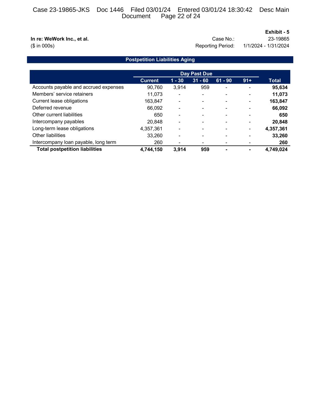 Exhibit - 5 In re: WeWork Inc., et al. Case No.: 23-19865 ($ in 000s) Reporting Period: 1/1/2024 - 1/31/2024 Postpetition Liabilities Aging Day Past Due Current 1 - 30 31 - 60 61 - 90 91+ Total Accounts payable and accrued expenses 90,760 3,914 959 - - 95,634 Members’ service retainers 11,073 - - - - 11,073 Current lease obligations 163,847 - - - - 163,847 Deferred revenue 66,092 - - - - 66,092 Other current liabilities 650 - - - - 650 Intercompany payables 20,848 - - - - 20,848 Long-term lease obligations 4,357,361 - - - - 4,357,361 Other liabilities 33,260 - - - - 33,260 Intercompany loan payable, long term 260 - - - - 260 Total postpetition liabilities 4,744,150 3,914 959 - - 4,749,024 Case 23-19865-JKS Doc 1446 Filed 03/01/24 Entered 03/01/24 18:30:42 Desc Main Document Page 22 of 24