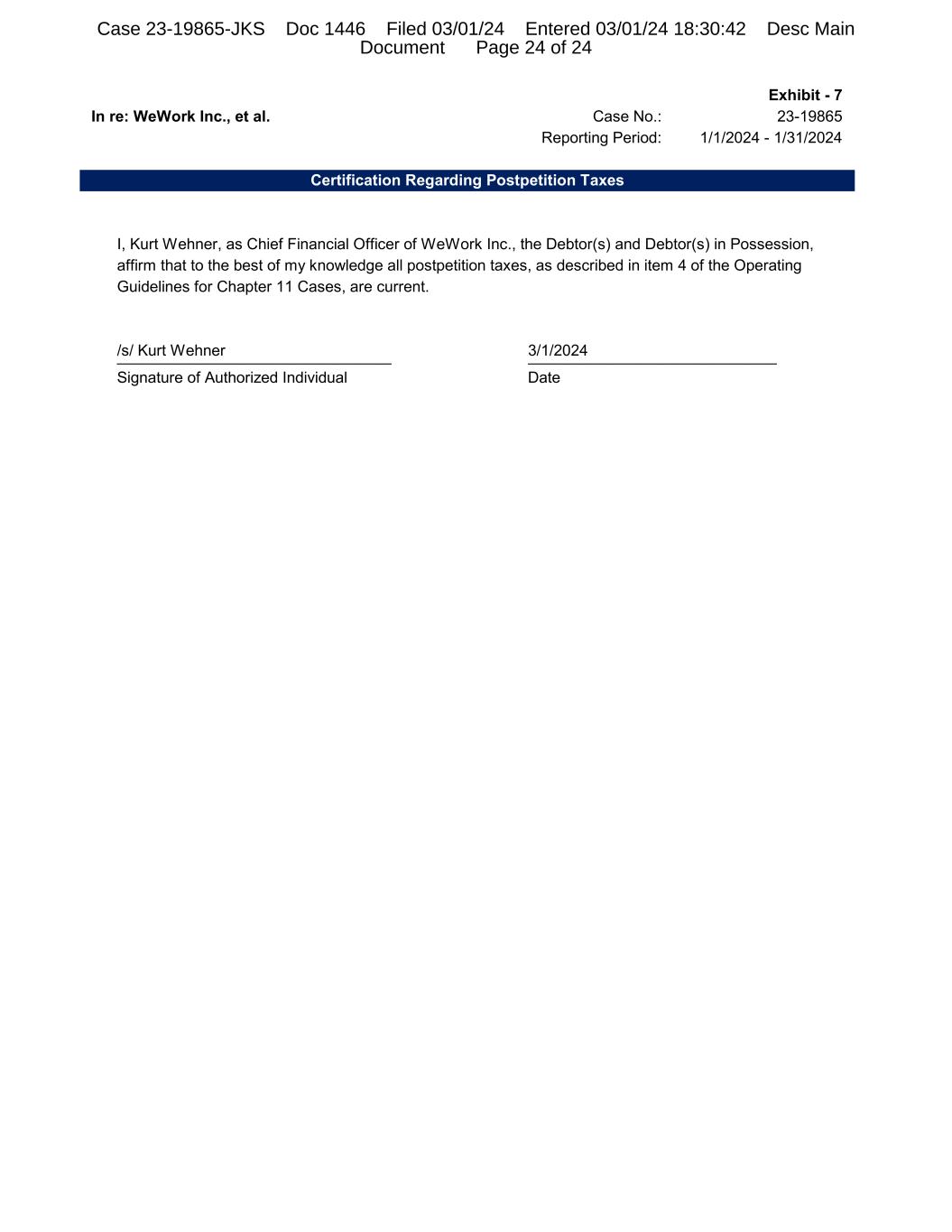 Exhibit - 7 In re: WeWork Inc., et al. Case No.: 23-19865 Reporting Period: 1/1/2024 - 1/31/2024 Certification Regarding Postpetition Taxes I, Kurt Wehner, as Chief Financial Officer of WeWork Inc., the Debtor(s) and Debtor(s) in Possession, affirm that to the best of my knowledge all postpetition taxes, as described in item 4 of the Operating Guidelines for Chapter 11 Cases, are current. /s/ Kurt Wehner 3/1/2024________________________________ _____________________________ Signature of Authorized Individual Date Case 23-19865-JKS Doc 1446 Filed 03/01/24 Entered 03/01/24 18:30:42 Desc Main Document Page 24 of 24