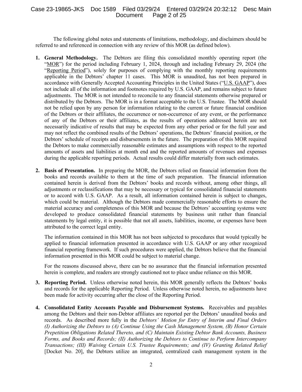 2 The following global notes and statements of limitations, methodology, and disclaimers should be referred to and referenced in connection with any review of this MOR (as defined below). 1. General Methodology. The Debtors are filing this consolidated monthly operating report (the “MOR”) for the period including February 1, 2024, through and including February 29, 2024 (the “Reporting Period”), solely for purposes of complying with the monthly reporting requirements applicable in the Debtors’ chapter 11 cases. This MOR is unaudited, has not been prepared in accordance with Generally Accepted Accounting Principles in the United States (“U.S. GAAP”), does not include all of the information and footnotes required by U.S. GAAP, and remains subject to future adjustments. The MOR is not intended to reconcile to any financial statements otherwise prepared or distributed by the Debtors. The MOR is in a format acceptable to the U.S. Trustee. The MOR should not be relied upon by any person for information relating to the current or future financial condition of the Debtors or their affiliates, the occurrence or non-occurrence of any event, or the performance of any of the Debtors or their affiliates, as the results of operations addressed herein are not necessarily indicative of results that may be expected from any other period or for the full year and may not reflect the combined results of the Debtors’ operations, the Debtors’ financial position, or the Debtors’ schedule of receipts and disbursements in the future. The preparation of this MOR required the Debtors to make commercially reasonable estimates and assumptions with respect to the reported amounts of assets and liabilities at month end and the reported amounts of revenues and expenses during the applicable reporting periods. Actual results could differ materially from such estimates. 2. Basis of Presentation. In preparing the MOR, the Debtors relied on financial information from the books and records available to them at the time of such preparation. The financial information contained herein is derived from the Debtors’ books and records without, among other things, all adjustments or reclassifications that may be necessary or typical for consolidated financial statements or to accord with U.S. GAAP. As a result, all information contained herein is subject to changes, which could be material. Although the Debtors made commercially reasonable efforts to ensure the material accuracy and completeness of this MOR and because the Debtors’ accounting systems were developed to produce consolidated financial statements by business unit rather than financial statements by legal entity, it is possible that not all assets, liabilities, income, or expenses have been attributed to the correct legal entity. The information contained in this MOR has not been subjected to procedures that would typically be applied to financial information presented in accordance with U.S. GAAP or any other recognized financial reporting framework. If such procedures were applied, the Debtors believe that the financial information presented in this MOR could be subject to material change. For the reasons discussed above, there can be no assurance that the financial information presented herein is complete, and readers are strongly cautioned not to place undue reliance on this MOR. 3. Reporting Period. Unless otherwise noted herein, this MOR generally reflects the Debtors’ books and records for the applicable Reporting Period. Unless otherwise noted herein, no adjustments have been made for activity occurring after the close of the Reporting Period. 4. Consolidated Entity Accounts Payable and Disbursement Systems. Receivables and payables among the Debtors and their non-Debtor affiliates are reported per the Debtors’ unaudited books and records. As described more fully in the Debtors’ Motion for Entry of Interim and Final Orders (I) Authorizing the Debtors to (A) Continue Using the Cash Management System, (B) Honor Certain Prepetition Obligations Related Thereto, and (C) Maintain Existing Debtor Bank Accounts, Business Forms, and Books and Records; (II) Authorizing the Debtors to Continue to Perform Intercompany Transactions; (III) Waiving Certain U.S. Trustee Requirements; and (IV) Granting Related Relief [Docket No. 20], the Debtors utilize an integrated, centralized cash management system in the Case 23-19865-JKS Doc 1589 Filed 03/29/24 Entered 03/29/24 20:32:12 Desc Main Document Page 2 of 25