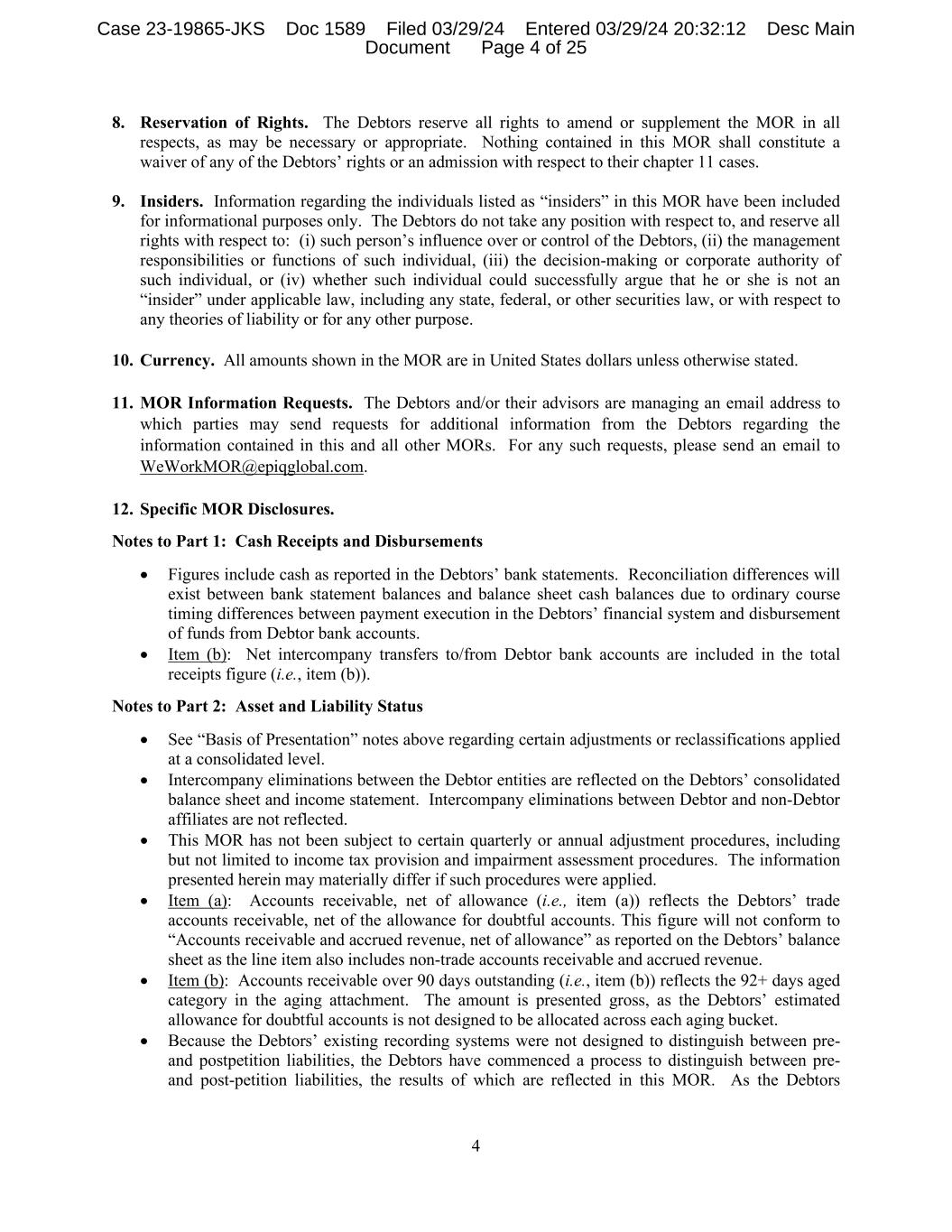 4 8. Reservation of Rights. The Debtors reserve all rights to amend or supplement the MOR in all respects, as may be necessary or appropriate. Nothing contained in this MOR shall constitute a waiver of any of the Debtors’ rights or an admission with respect to their chapter 11 cases. 9. Insiders. Information regarding the individuals listed as “insiders” in this MOR have been included for informational purposes only. The Debtors do not take any position with respect to, and reserve all rights with respect to: (i) such person’s influence over or control of the Debtors, (ii) the management responsibilities or functions of such individual, (iii) the decision-making or corporate authority of such individual, or (iv) whether such individual could successfully argue that he or she is not an “insider” under applicable law, including any state, federal, or other securities law, or with respect to any theories of liability or for any other purpose. 10. Currency. All amounts shown in the MOR are in United States dollars unless otherwise stated. 11. MOR Information Requests. The Debtors and/or their advisors are managing an email address to which parties may send requests for additional information from the Debtors regarding the information contained in this and all other MORs. For any such requests, please send an email to WeWorkMOR@epiqglobal.com. 12. Specific MOR Disclosures. Notes to Part 1: Cash Receipts and Disbursements • Figures include cash as reported in the Debtors’ bank statements. Reconciliation differences will exist between bank statement balances and balance sheet cash balances due to ordinary course timing differences between payment execution in the Debtors’ financial system and disbursement of funds from Debtor bank accounts. • Item (b): Net intercompany transfers to/from Debtor bank accounts are included in the total receipts figure (i.e., item (b)). Notes to Part 2: Asset and Liability Status • See “Basis of Presentation” notes above regarding certain adjustments or reclassifications applied at a consolidated level. • Intercompany eliminations between the Debtor entities are reflected on the Debtors’ consolidated balance sheet and income statement. Intercompany eliminations between Debtor and non-Debtor affiliates are not reflected. • This MOR has not been subject to certain quarterly or annual adjustment procedures, including but not limited to income tax provision and impairment assessment procedures. The information presented herein may materially differ if such procedures were applied. • Item (a): Accounts receivable, net of allowance (i.e., item (a)) reflects the Debtors’ trade accounts receivable, net of the allowance for doubtful accounts. This figure will not conform to “Accounts receivable and accrued revenue, net of allowance” as reported on the Debtors’ balance sheet as the line item also includes non-trade accounts receivable and accrued revenue. • Item (b): Accounts receivable over 90 days outstanding (i.e., item (b)) reflects the 92+ days aged category in the aging attachment. The amount is presented gross, as the Debtors’ estimated allowance for doubtful accounts is not designed to be allocated across each aging bucket. • Because the Debtors’ existing recording systems were not designed to distinguish between pre- and postpetition liabilities, the Debtors have commenced a process to distinguish between pre- and post-petition liabilities, the results of which are reflected in this MOR. As the Debtors Case 23-19865-JKS Doc 1589 Filed 03/29/24 Entered 03/29/24 20:32:12 Desc Main Document Page 4 of 25
