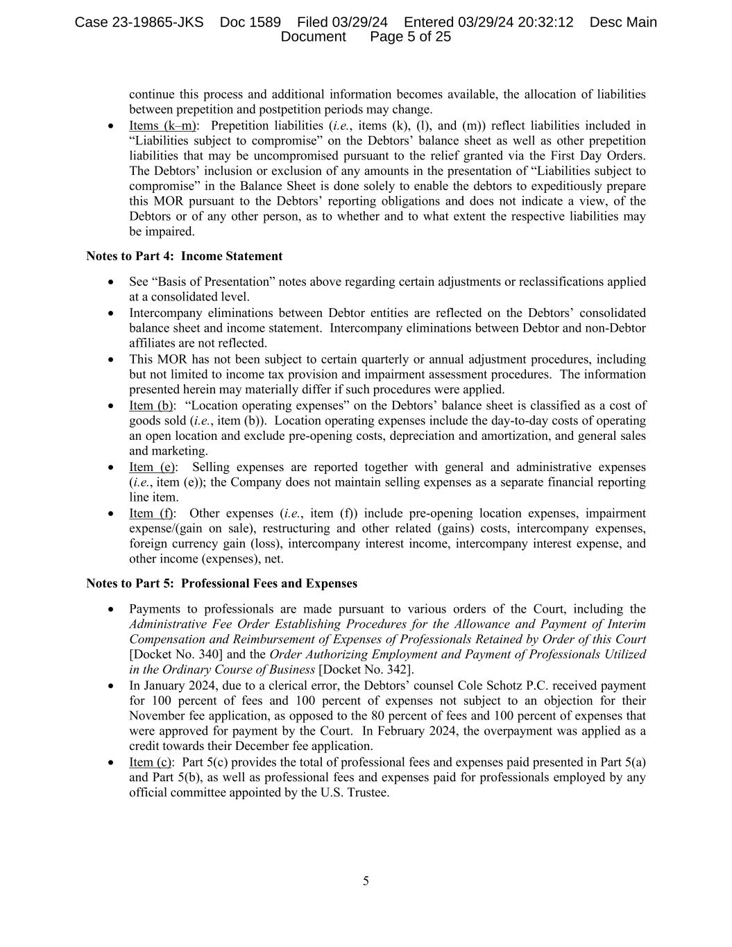 5 continue this process and additional information becomes available, the allocation of liabilities between prepetition and postpetition periods may change. • Items (k–m): Prepetition liabilities (i.e., items (k), (l), and (m)) reflect liabilities included in “Liabilities subject to compromise” on the Debtors’ balance sheet as well as other prepetition liabilities that may be uncompromised pursuant to the relief granted via the First Day Orders. The Debtors’ inclusion or exclusion of any amounts in the presentation of “Liabilities subject to compromise” in the Balance Sheet is done solely to enable the debtors to expeditiously prepare this MOR pursuant to the Debtors’ reporting obligations and does not indicate a view, of the Debtors or of any other person, as to whether and to what extent the respective liabilities may be impaired. Notes to Part 4: Income Statement • See “Basis of Presentation” notes above regarding certain adjustments or reclassifications applied at a consolidated level. • Intercompany eliminations between Debtor entities are reflected on the Debtors’ consolidated balance sheet and income statement. Intercompany eliminations between Debtor and non-Debtor affiliates are not reflected. • This MOR has not been subject to certain quarterly or annual adjustment procedures, including but not limited to income tax provision and impairment assessment procedures. The information presented herein may materially differ if such procedures were applied. • Item (b): “Location operating expenses” on the Debtors’ balance sheet is classified as a cost of goods sold (i.e., item (b)). Location operating expenses include the day-to-day costs of operating an open location and exclude pre-opening costs, depreciation and amortization, and general sales and marketing. • Item (e): Selling expenses are reported together with general and administrative expenses (i.e., item (e)); the Company does not maintain selling expenses as a separate financial reporting line item. • Item (f): Other expenses (i.e., item (f)) include pre-opening location expenses, impairment expense/(gain on sale), restructuring and other related (gains) costs, intercompany expenses, foreign currency gain (loss), intercompany interest income, intercompany interest expense, and other income (expenses), net. Notes to Part 5: Professional Fees and Expenses • Payments to professionals are made pursuant to various orders of the Court, including the Administrative Fee Order Establishing Procedures for the Allowance and Payment of Interim Compensation and Reimbursement of Expenses of Professionals Retained by Order of this Court [Docket No. 340] and the Order Authorizing Employment and Payment of Professionals Utilized in the Ordinary Course of Business [Docket No. 342]. • In January 2024, due to a clerical error, the Debtors’ counsel Cole Schotz P.C. received payment for 100 percent of fees and 100 percent of expenses not subject to an objection for their November fee application, as opposed to the 80 percent of fees and 100 percent of expenses that were approved for payment by the Court. In February 2024, the overpayment was applied as a credit towards their December fee application. • Item (c): Part 5(c) provides the total of professional fees and expenses paid presented in Part 5(a) and Part 5(b), as well as professional fees and expenses paid for professionals employed by any official committee appointed by the U.S. Trustee. Case 23-19865-JKS Doc 1589 Filed 03/29/24 Entered 03/29/24 20:32:12 Desc Main Document Page 5 of 25