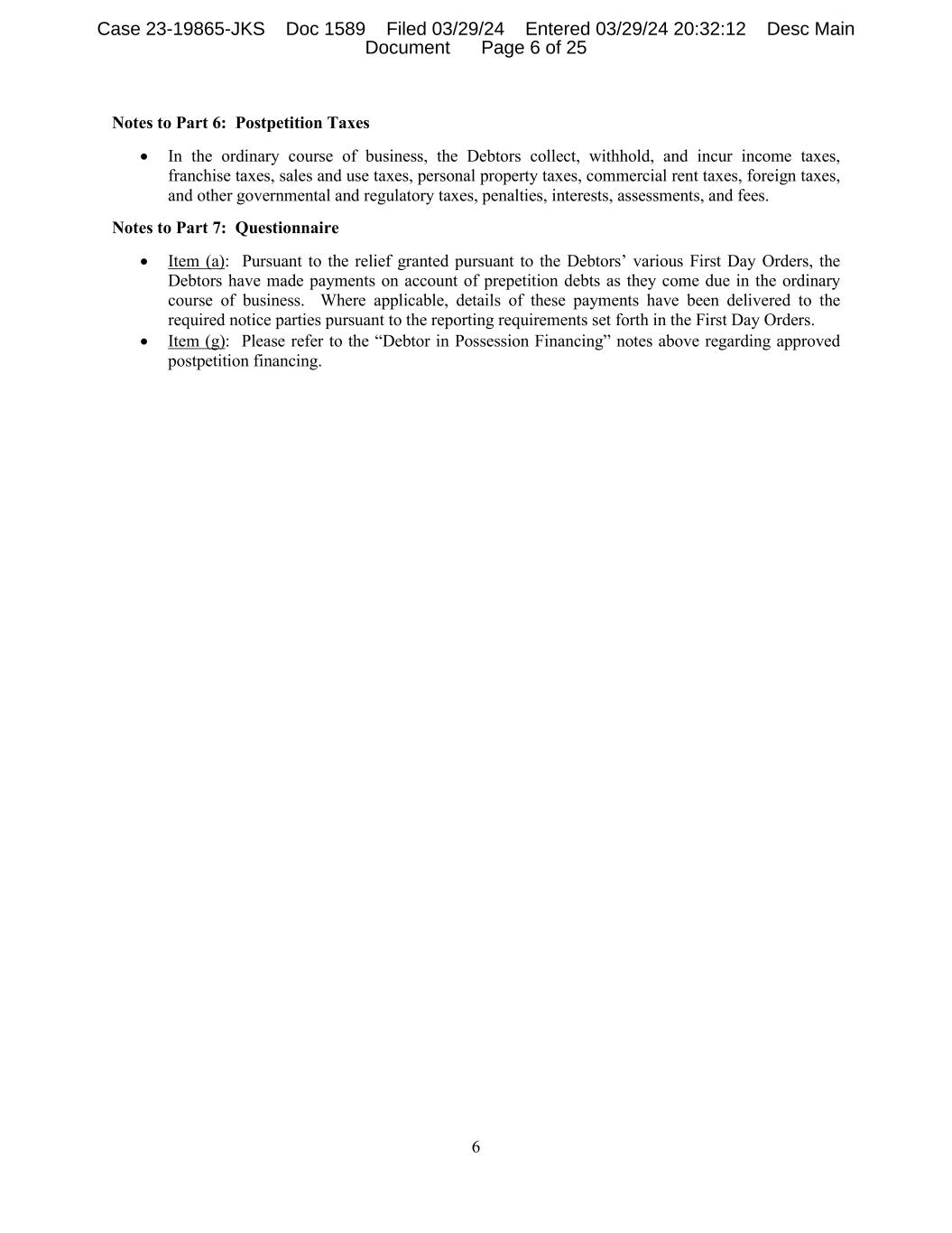 6 Notes to Part 6: Postpetition Taxes • In the ordinary course of business, the Debtors collect, withhold, and incur income taxes, franchise taxes, sales and use taxes, personal property taxes, commercial rent taxes, foreign taxes, and other governmental and regulatory taxes, penalties, interests, assessments, and fees. Notes to Part 7: Questionnaire • Item (a): Pursuant to the relief granted pursuant to the Debtors’ various First Day Orders, the Debtors have made payments on account of prepetition debts as they come due in the ordinary course of business. Where applicable, details of these payments have been delivered to the required notice parties pursuant to the reporting requirements set forth in the First Day Orders. • Item (g): Please refer to the “Debtor in Possession Financing” notes above regarding approved postpetition financing. Case 23-19865-JKS Doc 1589 Filed 03/29/24 Entered 03/29/24 20:32:12 Desc Main Document Page 6 of 25