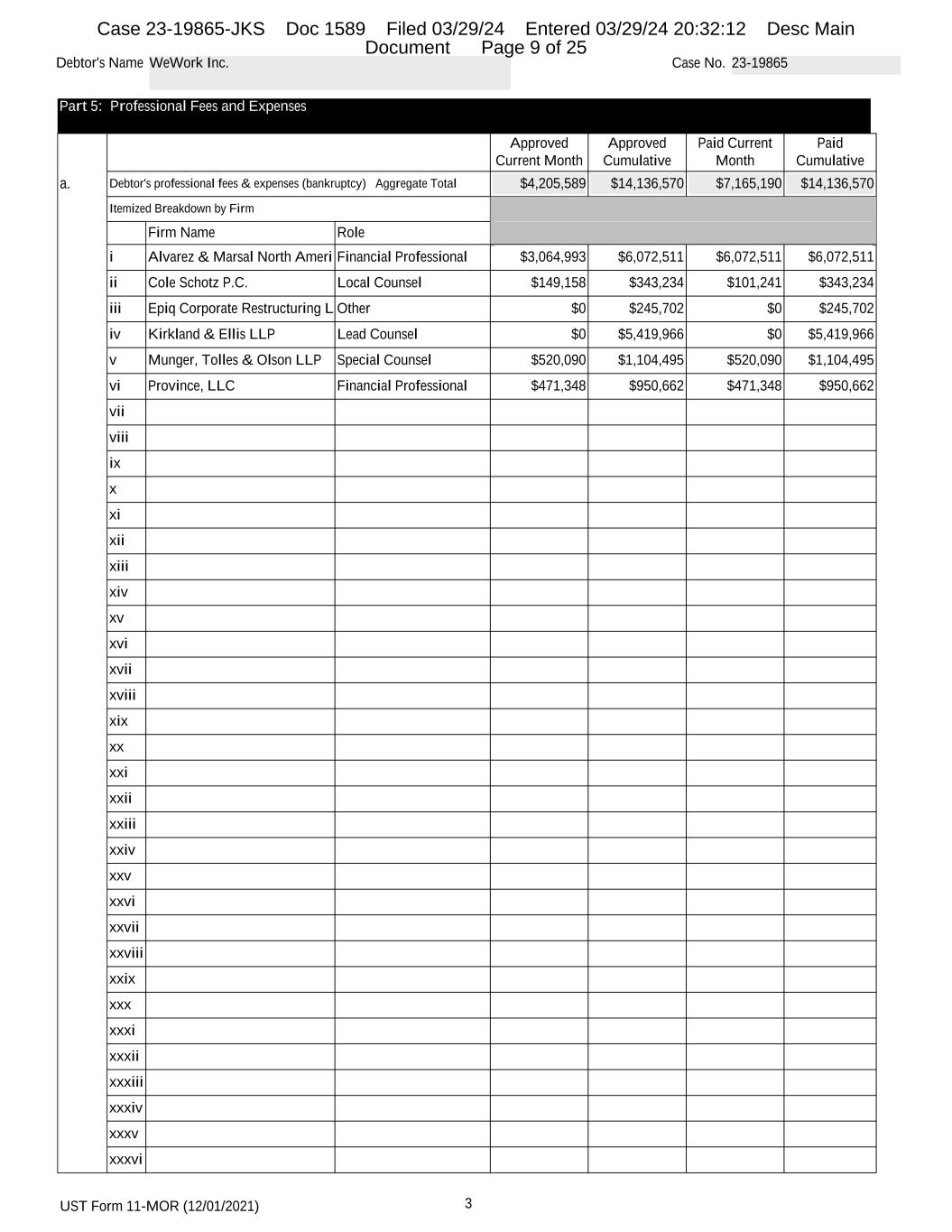 UST Form 11-MOR (12/01/2021) 3 Debtor's Name WeWork Inc. Case No. 23-19865 Part 5: Professional Fees and Expenses Approved Current Month Approved Cumulative Paid Current Month Paid Cumulative a. Debtor's professional fees & expenses (bankruptcy) Aggregate Total $4,205,589 $14,136,570 $7,165,190 $14,136,570 Itemized Breakdown by Firm Firm Name Role i Alvarez & Marsal North Ameri Financial Professional $3,064,993 $6,072,511 $6,072,511 $6,072,511 ii Cole Schotz P.C. Local Counsel $149,158 $343,234 $101,241 $343,234 iii Epiq Corporate Restructuring L Other $0 $245,702 $0 $245,702 iv Kirkland & Ellis LLP Lead Counsel $0 $5,419,966 $0 $5,419,966 v Munger, Tolles & Olson LLP Special Counsel $520,090 $1,104,495 $520,090 $1,104,495 vi Province, LLC Financial Professional $471,348 $950,662 $471,348 $950,662 vii viii ix x xi xii xiii xiv xv xvi xvii xviii xix xx xxi xxii xxiii xxiv xxv xxvi xxvii xxviii xxix xxx xxxi xxxii xxxiii xxxiv xxxv xxxvi Case 23-19865-JKS Doc 1589 Filed 03/29/24 Entered 03/29/24 20:32:12 Desc Main Document Page 9 of 25
