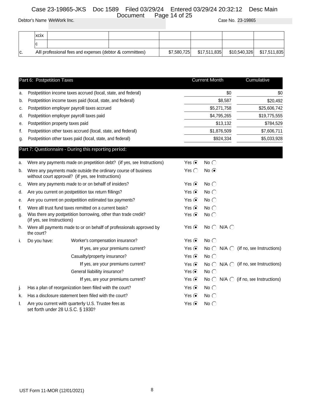 UST Form 11-MOR (12/01/2021) 8 Debtor's Name WeWork Inc. Case No. 23-19865 xcix c c. All professional fees and expenses (debtor & committees) $7,580,725 $17,511,835 $10,540,326 $17,511,835 Part 6: Postpetition Taxes Current Month Cumulative a. Postpetition income taxes accrued (local, state, and federal) $0 $0 b. Postpetition income taxes paid (local, state, and federal) $8,587 $20,492 c. Postpetition employer payroll taxes accrued $5,271,758 $25,606,742 d. Postpetition employer payroll taxes paid $4,795,265 $19,775,555 e. Postpetition property taxes paid $13,132 $784,529 f. Postpetition other taxes accrued (local, state, and federal) $1,876,509 $7,606,711 g. Postpetition other taxes paid (local, state, and federal) $924,334 $5,033,928 Part 7: Questionnaire - During this reporting period: a. Were any payments made on prepetition debt? (if yes, see Instructions) Yes No b. Yes NoWere any payments made outside the ordinary course of business without court approval? (if yes, see Instructions) c. Yes NoWere any payments made to or on behalf of insiders? d. Yes NoAre you current on postpetition tax return filings? e. Yes NoAre you current on postpetition estimated tax payments? f. Were all trust fund taxes remitted on a current basis? Yes No g. Yes NoWas there any postpetition borrowing, other than trade credit? (if yes, see Instructions) h. Were all payments made to or on behalf of professionals approved by the court? Yes No N/A i. Do you have: Worker's compensation insurance? Yes No If yes, are your premiums current? Yes No N/A (if no, see Instructions) Casualty/property insurance? Yes No If yes, are your premiums current? Yes No N/A (if no, see Instructions) General liability insurance? Yes No If yes, are your premiums current? Yes No N/A (if no, see Instructions) j. Has a plan of reorganization been filed with the court? Yes No k. Has a disclosure statement been filed with the court? Yes No l. Are you current with quarterly U.S. Trustee fees as set forth under 28 U.S.C. § 1930? Yes No Case 23-19865-JKS Doc 1589 Filed 03/29/24 Entered 03/29/24 20:32:12 Desc Main Document Page 14 of 25