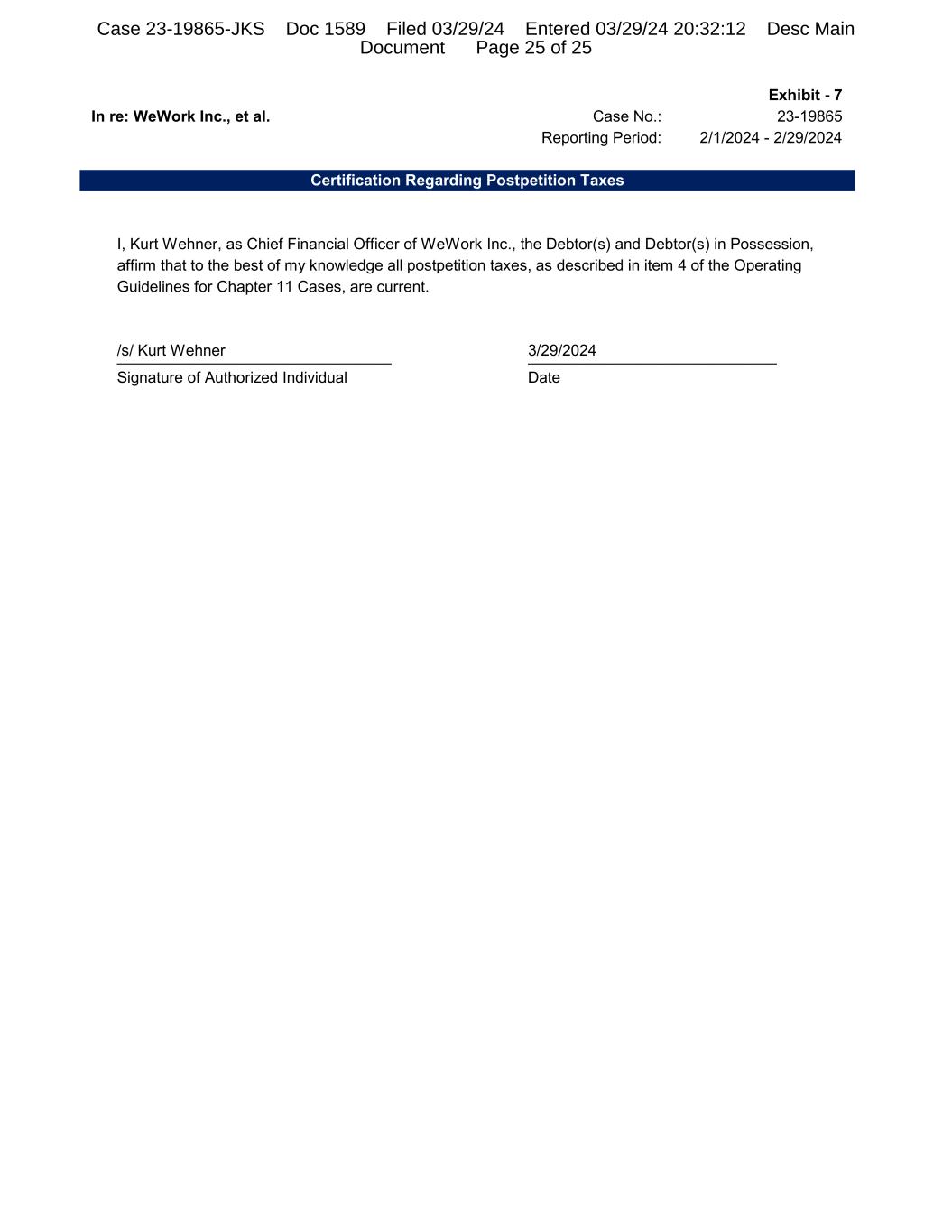 Exhibit - 7 In re: WeWork Inc., et al. Case No.: 23-19865 Reporting Period: 2/1/2024 - 2/29/2024 Certification Regarding Postpetition Taxes I, Kurt Wehner, as Chief Financial Officer of WeWork Inc., the Debtor(s) and Debtor(s) in Possession, affirm that to the best of my knowledge all postpetition taxes, as described in item 4 of the Operating Guidelines for Chapter 11 Cases, are current. /s/ Kurt Wehner 3/29/2024________________________________ _____________________________ Signature of Authorized Individual Date Case 23-19865-JKS Doc 1589 Filed 03/29/24 Entered 03/29/24 20:32:12 Desc Main Document Page 25 of 25