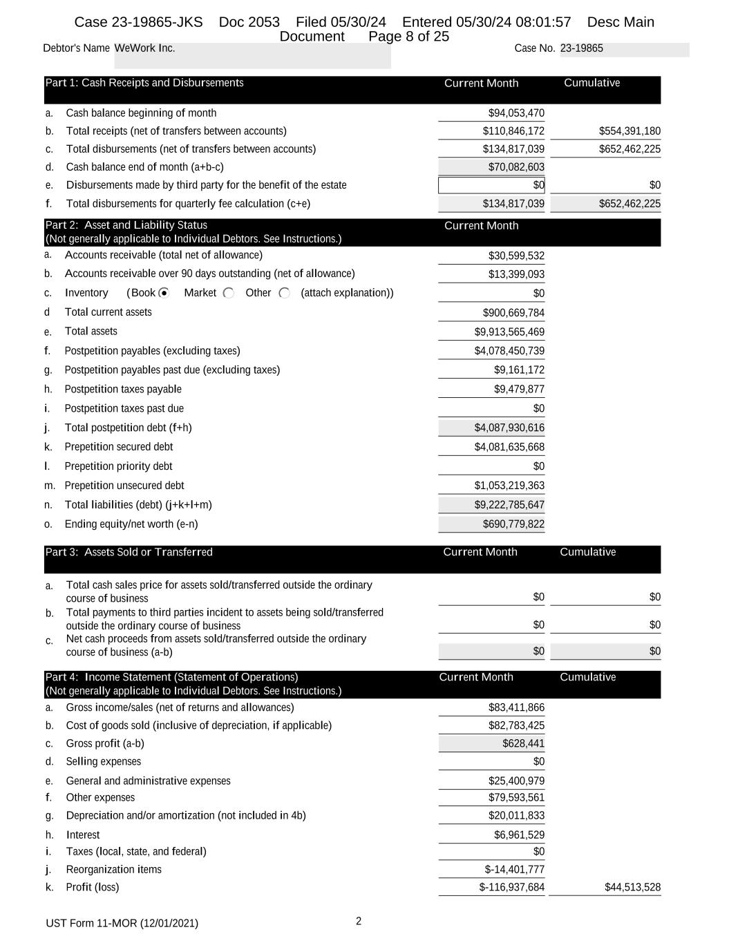 UST Form 11-MOR (12/01/2021) 2 Debtor's Name WeWork Inc. Case No. 23-19865 Part 1: Cash Receipts and Disbursements Current Month Cumulative a. Cash balance beginning of month $94,053,470 b. Total receipts (net of transfers between accounts) $110,846,172 $554,391,180 c. Total disbursements (net of transfers between accounts) $134,817,039 $652,462,225 d. Cash balance end of month (a+b-c) $70,082,603 e. Disbursements made by third party for the benefit of the estate $0 $0 f. Total disbursements for quarterly fee calculation (c+e) $134,817,039 $652,462,225 Part 2: Asset and Liability Status Current Month (Not generally applicable to Individual Debtors. See Instructions.) a. Accounts receivable (total net of allowance) $30,599,532 b. Accounts receivable over 90 days outstanding (net of allowance) $13,399,093 c. Inventory ( (attach explanation))Book Market Other $0 d Total current assets $900,669,784 e. Total assets $9,913,565,469 f. Postpetition payables (excluding taxes) $4,078,450,739 g. Postpetition payables past due (excluding taxes) $9,161,172 h. Postpetition taxes payable $9,479,877 i. Postpetition taxes past due $0 j. Total postpetition debt (f+h) $4,087,930,616 k. Prepetition secured debt $4,081,635,668 l. Prepetition priority debt $0 m. Prepetition unsecured debt $1,053,219,363 n. Total liabilities (debt) (j+k+l+m) $9,222,785,647 o. Ending equity/net worth (e-n) $690,779,822 Part 3: Assets Sold or Transferred Current Month Cumulative a. Total cash sales price for assets sold/transferred outside the ordinary course of business $0 $0 b. Total payments to third parties incident to assets being sold/transferred outside the ordinary course of business $0 $0 c. Net cash proceeds from assets sold/transferred outside the ordinary course of business (a-b) $0 $0 Part 4: Income Statement (Statement of Operations) Current Month Cumulative (Not generally applicable to Individual Debtors. See Instructions.) a. Gross income/sales (net of returns and allowances) $83,411,866 b. Cost of goods sold (inclusive of depreciation, if applicable) $82,783,425 c. Gross profit (a-b) $628,441 d. Selling expenses $0 e. General and administrative expenses $25,400,979 f. Other expenses $79,593,561 g. Depreciation and/or amortization (not included in 4b) $20,011,833 h. Interest $6,961,529 i. Taxes (local, state, and federal) $0 j. Reorganization items $-14,401,777 k. Profit (loss) $-116,937,684 $44,513,528 Case 23-19865-JKS Doc 2053 Filed 05/30/24 Entered 05/30/24 08:01:57 Desc Main Document Page 8 of 25