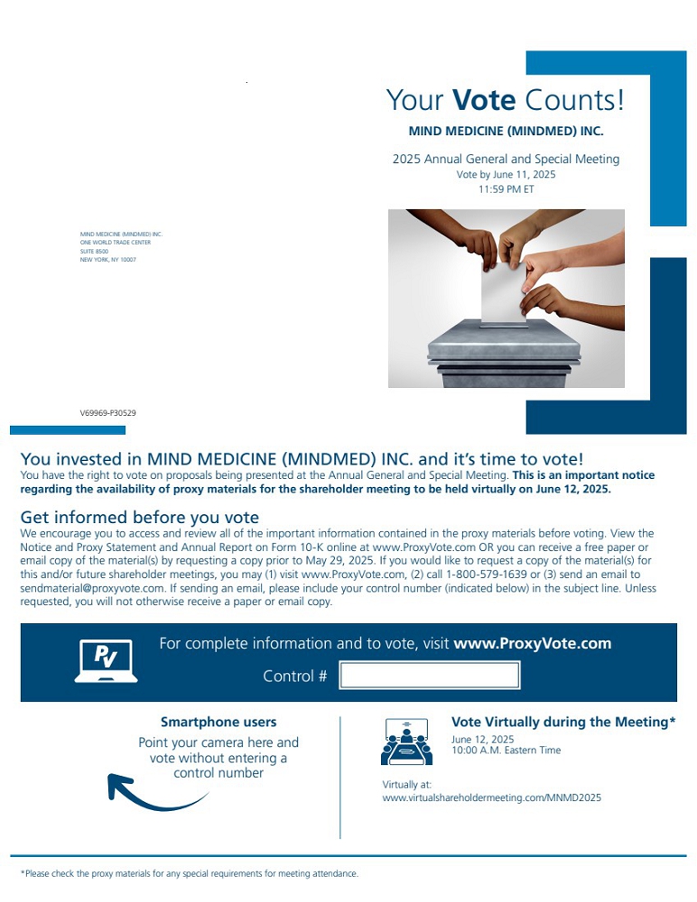 Your Vote Counts! MIND MEDICINE (MINDMED) INC. ONE WORLD TRADE CENTER SUITE 8500 NEW YORK, NY 10007 MIND MEDICINE (MINDMED) INC. 2025 Annual General and Special Meeting Vote by June 11, 2025 11:59 PM ET Vote Virtually during the Meeting* June 12, 2025 10:00 A.M. Eastern Time Virtually at: www.virtualshareholdermeeting.com/MNMD2025 *Please check the proxy materials for any special requirements for meeting attendance. Smartphone users Point your camera here and vote without entering a control number For complete information and to vote, visit www.ProxyVote.com Control # V69969-P30529 You invested in MIND MEDICINE (MINDMED) INC. and it’s time to vote! You have the right to vote on proposals being presented at the Annual General and Special Meeting. This is an important notice regarding the availability of proxy materials for the shareholder meeting to be held virtually on June 12, 2025. Get informed before you vote We encourage you to access and review all of the important information contained in the proxy materials before voting. View the Notice and Proxy Statement and Annual Report on Form 10-K online at www.ProxyVote.com OR you can receive a free paper or email copy of the material(s) by requesting a copy prior to May 29, 2025. If you would like to request a copy of the material(s) for this and/or future shareholder meetings, you may (1) visit www.ProxyVote.com, (2) call 1-800-579-1639 or (3) send an email to sendmaterial@proxyvote.com. If sending an email, please include your control number (indicated below) in the subject line. Unless requested, you will not otherwise receive a paper or email copy. |