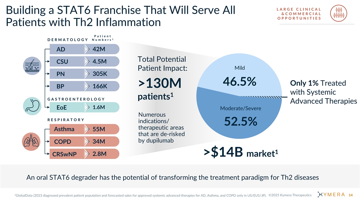 U N DR U G G E D OR Only STAT6 Degradation Has the Potential to IN AD E Q UAT E L Y D R U GGE D Lead to Dupilumab-Like Pathway Inhibition • STAT6, long pursued immunology “holy-grail” SMI target, has remained undrugged before KT-621 100 • Most oral approaches centered around small molecule inhibitors (SMIs), which have significant limitations • SMIs do not allow continuous and complete pathway blockade because of the direct PK-PD relationship 0 • Only degradation is expected to match dupilumab’s Day 1 Day 2 Day 3 pathway blockade with once-a-day oral delivery Oral Degrader 13 Pathway Signaling