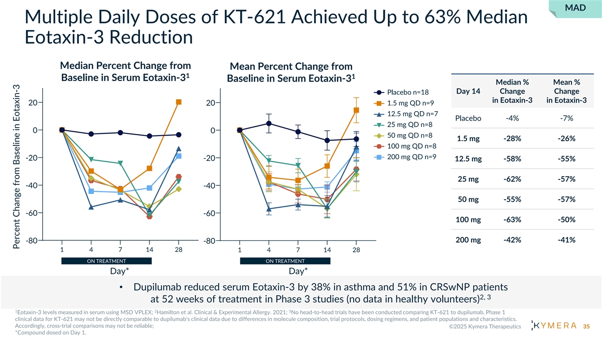 MAD High Variability and Minimal Changes in IgE with Multiple Daily Oral Doses of KT-621 Median % Change from Mean % Change from 1 1 Baseline in IgE Median% Mean % Baseline in IgE Day 14 Change Change Placebo n=18 10 10 In IgE In IgE 1.5 mg QD n=9 12.5 mg QD n=7 Placebo -13% -8% 25 mg QD n=8 50 mg QD n=8 1.5 mg -12% -13% 0 0 100 mg QD n=8 200 mg QD n=9 12.5 mg -7% -10% 25 mg -8% -7% -10 -10 50 mg -5% -5% 100 mg -11% -11% 200 mg -2% -1% -20 -20 1 4 7 14 28 1 4 7 14 28 ON TREATMENT ON TREATMENT Day* Day* • Results consistent with dupilumab effect on IgE in healthy volunteers 2 • Baseline IgE levels in line with dupilumab HV study 34 Percent Change from Baseline in IgE