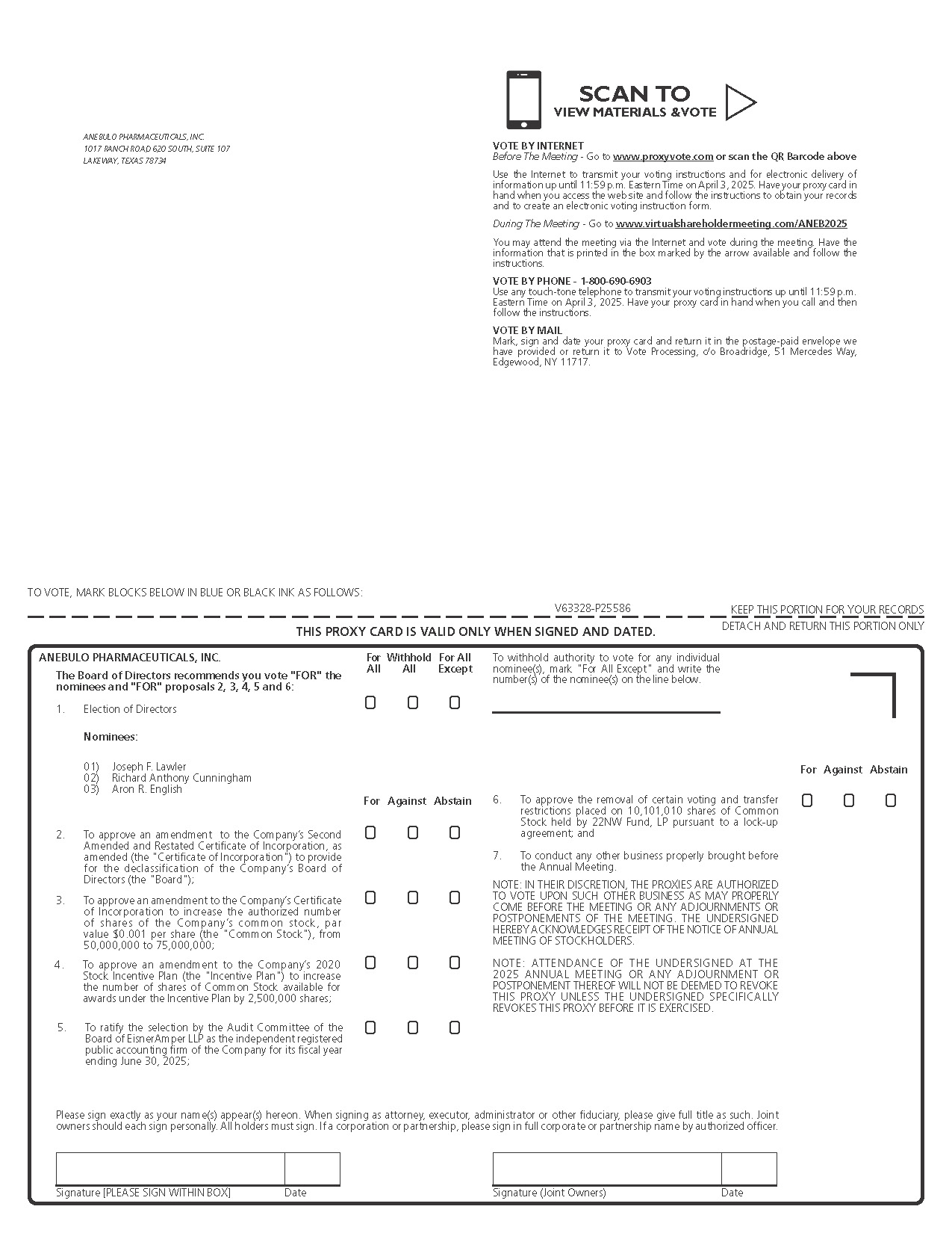 Important Notice Regarding the Availability of Proxy Materials for the Annual Meeting of Stockholders of the Company to Be Held on Friday, April 4, 2025 at 9:00 a.m. (Pacific Time) via live webcast at www.virtualshareholdermeeting.com/ANEB2025.