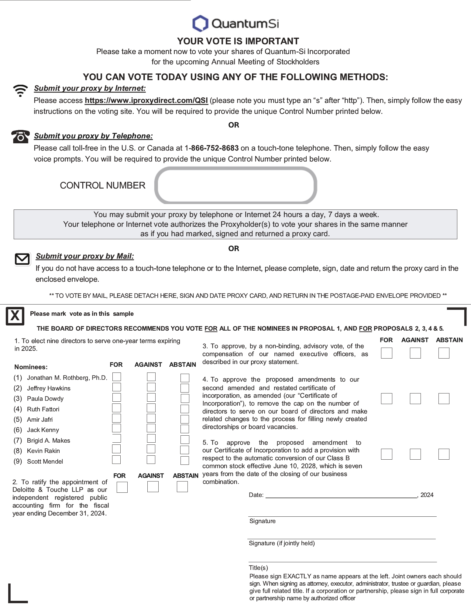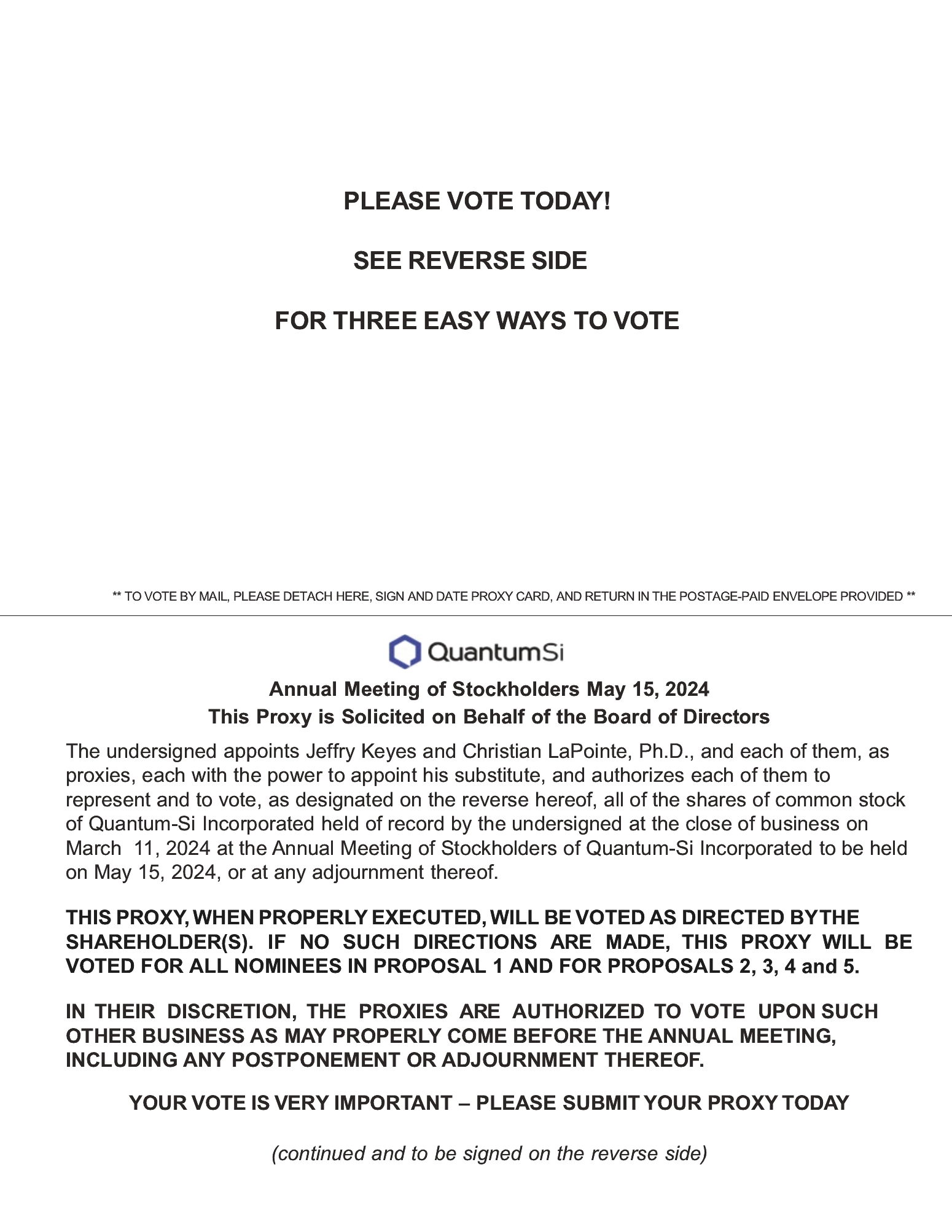 You are cordially invited to attend the 2024 annual meeting of stockholders of Quantum-Si Incorporated to be held at 12:00 p.m., Eastern Time, on Friday, May 15, 2024. This year’s annual meeting will be conducted solely via live webcast on the internet. You will be able to attend the annual meeting, vote and submit your questions during the annual meeting by visiting https://agm.issuerdirect.com/qsi. You will not be able to attend the annual meeting in person.