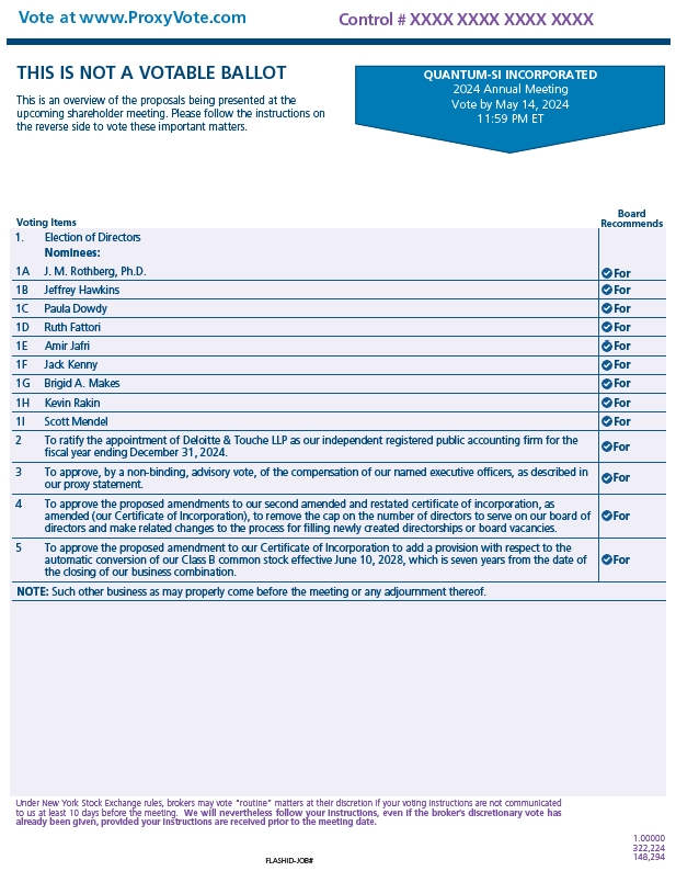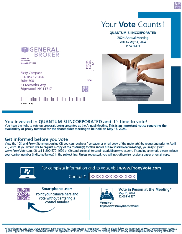9142 Farmingdale, NY 11735 XXXX XXXX XXXX XXXX QUANTUM-SI INCORPORATED 2024 Annual Meeting Vote by May 14, 2024 11:59 PM ET Vote in Person at the Meeting* May 15, 2024 12:00 PM EST Virtually at: https://www.iproxydirect.com/QSI