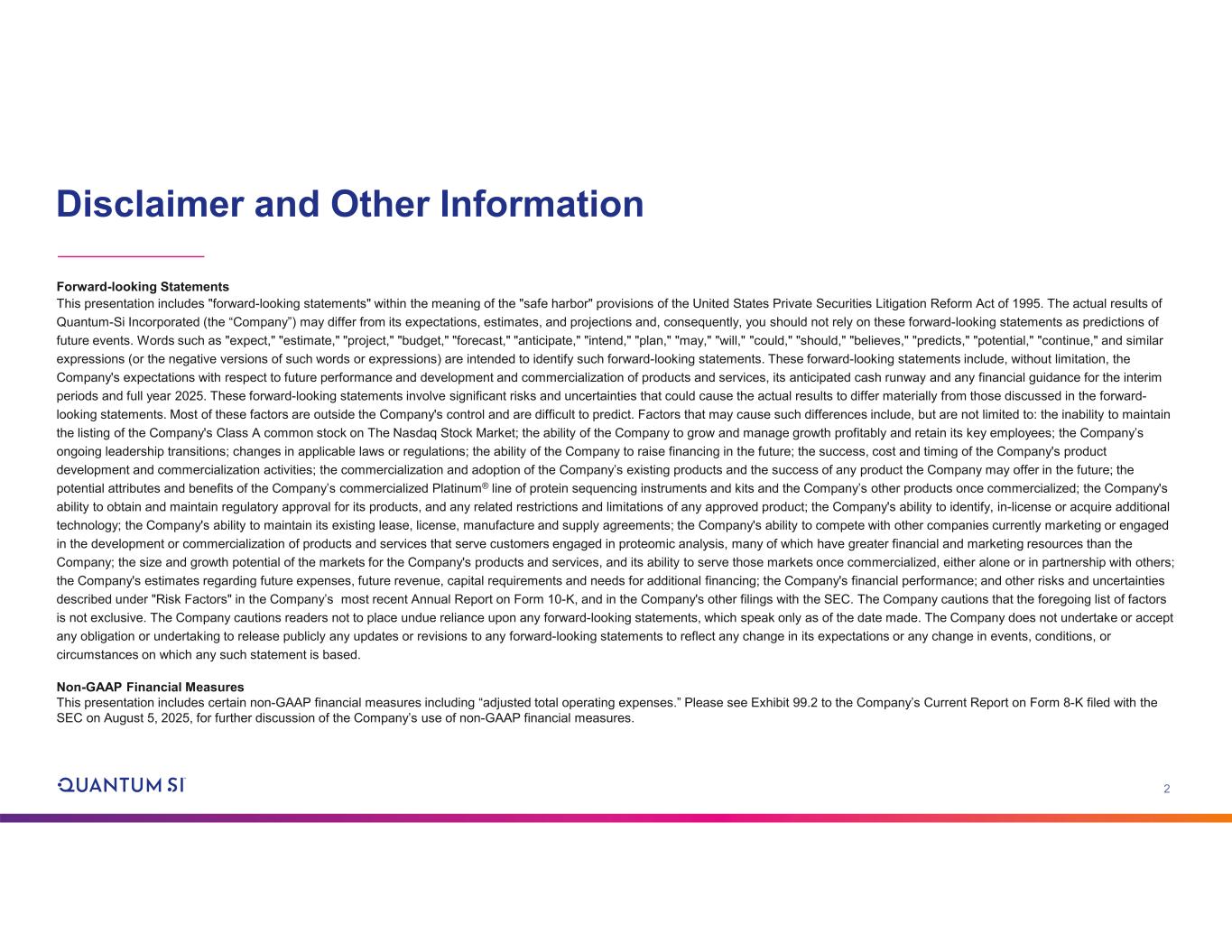 2 Disclaimer and Other Information Forward-looking Statements This presentation includes "forward-looking statements" within the meaning of the "safe harbor" provisions of the United States Private Securities Litigation Reform Act of 1995. The actual results of Quantum-Si Incorporated (the “Company”) may differ from its expectations, estimates, and projections and, consequently, you should not rely on these forward-looking statements as predictions of future events. Words such as "expect," "estimate," "project," "budget," "forecast," "anticipate," "intend," "plan," "may," "will," "could," "should," "believes," "predicts," "potential," "continue," and similar expressions (or the negative versions of such words or expressions) are intended to identify such forward-looking statements. These forward-looking statements include, without limitation, the Company's expectations with respect to future performance and development and commercialization of products and services, its anticipated cash runway and any financial guidance for the interim periods and full year 2025. These forward-looking statements involve significant risks and uncertainties that could cause the actual results to differ materially from those discussed in the forward- looking statements. Most of these factors are outside the Company's control and are difficult to predict. Factors that may cause such differences include, but are not limited to: the inability to maintain the listing of the Company's Class A common stock on The Nasdaq Stock Market; the ability of the Company to grow and manage growth profitably and retain its key employees; the Company’s ongoing leadership transitions; changes in applicable laws or regulations; the ability of the Company to raise financing in the future; the success, cost and timing of the Company's product development and commercialization activities; the commercialization and adoption of the Company’s existing products and the success of any product the Company may offer in the future; the potential attributes and benefits of the Company’s commercialized Platinum® line of protein sequencing instruments and kits and the Company’s other products once commercialized; the Company's ability to obtain and maintain regulatory approval for its products, and any related restrictions and limitations of any approved product; the Company's ability to identify, in-license or acquire additional technology; the Company's ability to maintain its existing lease, license, manufacture and supply agreements; the Company's ability to compete with other companies currently marketing or engaged in the development or commercialization of products and services that serve customers engaged in proteomic analysis, many of which have greater financial and marketing resources than the Company; the size and growth potential of the markets for the Company's products and services, and its ability to serve those markets once commercialized, either alone or in partnership with others; the Company's estimates regarding future expenses, future revenue, capital requirements and needs for additional financing; the Company's financial performance; and other risks and uncertainties described under "Risk Factors" in the Company’s most recent Annual Report on Form 10-K, and in the Company's other filings with the SEC. The Company cautions that the foregoing list of factors is not exclusive. The Company cautions readers not to place undue reliance upon any forward-looking statements, which speak only as of the date made. The Company does not undertake or accept any obligation or undertaking to release publicly any updates or revisions to any forward-looking statements to reflect any change in its expectations or any change in events, conditions, or circumstances on which any such statement is based. Non-GAAP Financial Measures This presentation includes certain non-GAAP financial measures including “adjusted total operating expenses.” Please see .2 to the Company’s Current Report on Form 8-K filed with the SEC on August 5, 2025, for further discussion of the Company’s use of non-GAAP financial measures.