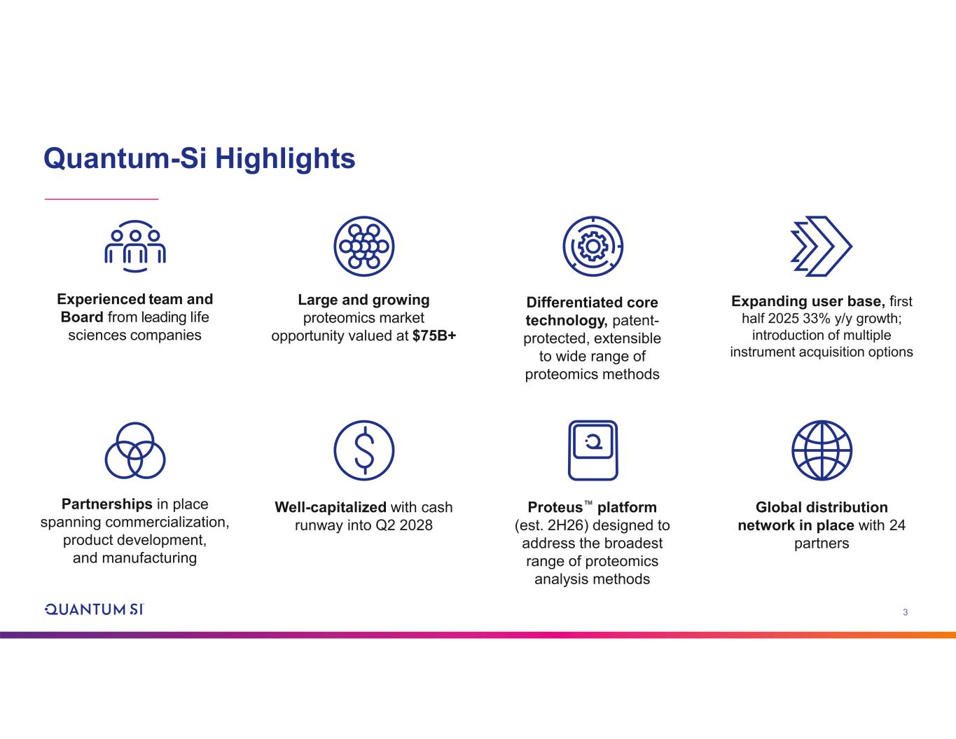 2 Disclaimer and Other Information Forward-looking Statements This presentation includes "forward-looking statements" within the meaning of the "safe harbor" provisions of the United States Private Securities Litigation Reform Act of 1995. The actual results of Quantum-Si Incorporated (the “Company”) may differ from its expectations, estimates, and projections and, consequently, you should not rely on these forward-looking statements as predictions of future events. Words such as "expect," "estimate," "project," "budget," "forecast," "anticipate," "intend," "plan," "may," "will," "could," "should," "believes," "predicts," "potential," "continue," and similar expressions (or the negative versions of such words or expressions) are intended to identify such forward-looking statements. These forward-looking statements include, without limitation, the Company's expectations with respect to future performance and development and commercialization of products and services, its anticipated cash runway and any financial guidance for the interim periods and full year 2025. These forward-looking statements involve significant risks and uncertainties that could cause the actual results to differ materially from those discussed in the forward- looking statements. Most of these factors are outside the Company's control and are difficult to predict. Factors that may cause such differences include, but are not limited to: the inability to maintain the listing of the Company's Class A common stock on The Nasdaq Stock Market; the ability of the Company to grow and manage growth profitably and retain its key employees; the Company’s ongoing leadership transitions; changes in applicable laws or regulations; the ability of the Company to raise financing in the future; the success, cost and timing of the Company's product development and commercialization activities; the commercialization and adoption of the Company’s existing products and the success of any product the Company may offer in the future; the potential attributes and benefits of the Company’s commercialized Platinum® line of protein sequencing instruments and kits and the Company’s other products once commercialized; the Company's ability to obtain and maintain regulatory approval for its products, and any related restrictions and limitations of any approved product; the Company's ability to identify, in-license or acquire additional technology; the Company's ability to maintain its existing lease, license, manufacture and supply agreements; the Company's ability to compete with other companies currently marketing or engaged in the development or commercialization of products and services that serve customers engaged in proteomic analysis, many of which have greater financial and marketing resources than the Company; the size and growth potential of the markets for the Company's products and services, and its ability to serve those markets once commercialized, either alone or in partnership with others; the Company's estimates regarding future expenses, future revenue, capital requirements and needs for additional financing; the Company's financial performance; and other risks and uncertainties described under "Risk Factors" in the Company’s most recent Annual Report on Form 10-K, and in the Company's other filings with the SEC. The Company cautions that the foregoing list of factors is not exclusive. The Company cautions readers not to place undue reliance upon any forward-looking statements, which speak only as of the date made. The Company does not undertake or accept any obligation or undertaking to release publicly any updates or revisions to any forward-looking statements to reflect any change in its expectations or any change in events, conditions, or circumstances on which any such statement is based. Non-GAAP Financial Measures This presentation includes certain non-GAAP financial measures including “adjusted total operating expenses.” Please see .2 to the Company’s Current Report on Form 8-K filed with the SEC on August 5, 2025, for further discussion of the Company’s use of non-GAAP financial measures.