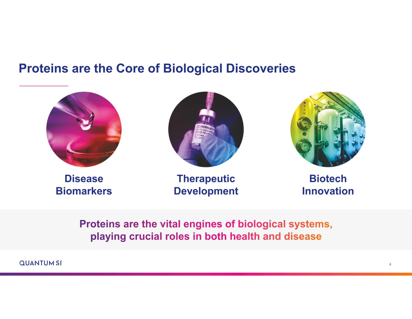3 Quantum-Si Highlights Experienced team and Board from leading life sciences companies Large and growing proteomics market opportunity valued at $75B+ Differentiated core technology, patent- protected, extensible to wide range of proteomics methods Partnerships in place spanning commercialization, product development, and manufacturing Well-capitalized with cash runway into Q2 2028 Proteus platform (est. 2H26) designed to address the broadest range of proteomics analysis methods Global distribution network in place with 24 partners Expanding user base, first half 2025 33% y/y growth; introduction of multiple instrument acquisition options