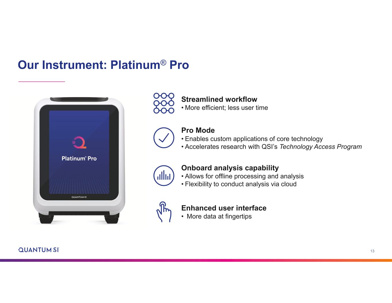 12 The Quantum-Si Solution Platinum® Pro sequences individual peptides by capturing the fluorescent signal from each amino acid Sequence Analyze Our analysis software automates the work and provides amino acid-level insights Library Prep and Sequencing Kits contain everything you need to prepare peptide libraries for sequencing Prepare