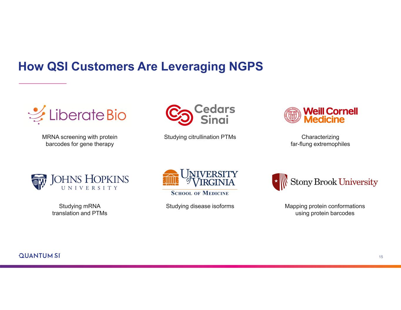 14 Post-translational modifications Amino acid variants RNA isoforms Use Cases Today In-gel digest of bio samples Characterize antibodies Identify co-IP proteins Protein/antibody engineering mRNA vaccine development Lipid nanoparticle delivery