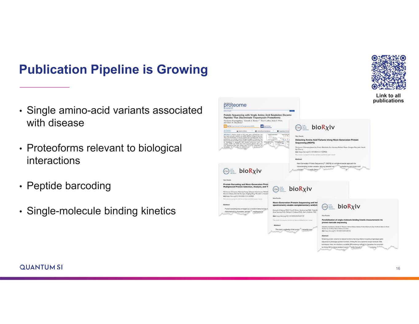 15 How QSI Customers Are Leveraging NGPS MRNA screening with protein barcodes for gene therapy Studying citrullination PTMs Characterizing far-flung extremophiles Studying mRNA translation and PTMs Studying disease isoforms Mapping protein conformations using protein barcodes
