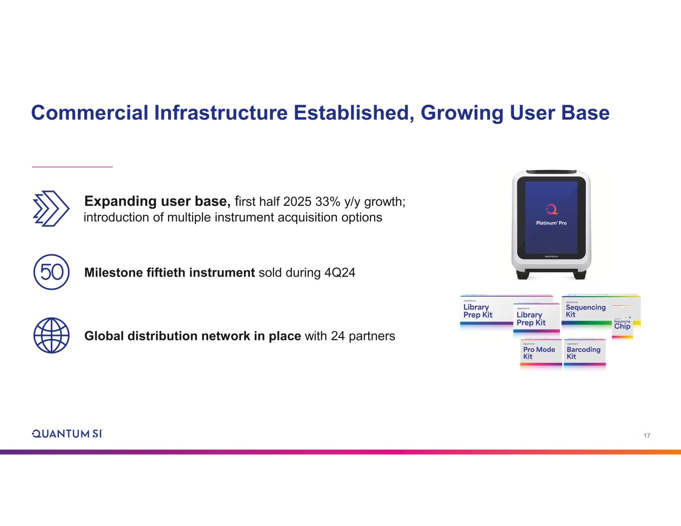 2 Disclaimer and Other Information Forward-looking Statements This presentation includes "forward-looking statements" within the meaning of the "safe harbor" provisions of the United States Private Securities Litigation Reform Act of 1995. The actual results of Quantum-Si Incorporated (the “Company”) may differ from its expectations, estimates, and projections and, consequently, you should not rely on these forward-looking statements as predictions of future events. Words such as "expect," "estimate," "project," "budget," "forecast," "anticipate," "intend," "plan," "may," "will," "could," "should," "believes," "predicts," "potential," "continue," and similar expressions (or the negative versions of such words or expressions) are intended to identify such forward-looking statements. These forward-looking statements include, without limitation, the Company's expectations with respect to future performance and development and commercialization of products and services, its anticipated cash runway and any financial guidance for the interim periods and full year 2025. These forward-looking statements involve significant risks and uncertainties that could cause the actual results to differ materially from those discussed in the forward- looking statements. Most of these factors are outside the Company's control and are difficult to predict. Factors that may cause such differences include, but are not limited to: the inability to maintain the listing of the Company's Class A common stock on The Nasdaq Stock Market; the ability of the Company to grow and manage growth profitably and retain its key employees; the Company’s ongoing leadership transitions; changes in applicable laws or regulations; the ability of the Company to raise financing in the future; the success, cost and timing of the Company's product development and commercialization activities; the commercialization and adoption of the Company’s existing products and the success of any product the Company may offer in the future; the potential attributes and benefits of the Company’s commercialized Platinum® line of protein sequencing instruments and kits and the Company’s other products once commercialized; the Company's ability to obtain and maintain regulatory approval for its products, and any related restrictions and limitations of any approved product; the Company's ability to identify, in-license or acquire additional technology; the Company's ability to maintain its existing lease, license, manufacture and supply agreements; the Company's ability to compete with other companies currently marketing or engaged in the development or commercialization of products and services that serve customers engaged in proteomic analysis, many of which have greater financial and marketing resources than the Company; the size and growth potential of the markets for the Company's products and services, and its ability to serve those markets once commercialized, either alone or in partnership with others; the Company's estimates regarding future expenses, future revenue, capital requirements and needs for additional financing; the Company's financial performance; and other risks and uncertainties described under "Risk Factors" in the Company’s most recent Annual Report on Form 10-K, and in the Company's other filings with the SEC. The Company cautions that the foregoing list of factors is not exclusive. The Company cautions readers not to place undue reliance upon any forward-looking statements, which speak only as of the date made. The Company does not undertake or accept any obligation or undertaking to release publicly any updates or revisions to any forward-looking statements to reflect any change in its expectations or any change in events, conditions, or circumstances on which any such statement is based. Non-GAAP Financial Measures This presentation includes certain non-GAAP financial measures including “adjusted total operating expenses.” Please see .2 to the Company’s Current Report on Form 8-K filed with the SEC on August 5, 2025, for further discussion of the Company’s use of non-GAAP financial measures.