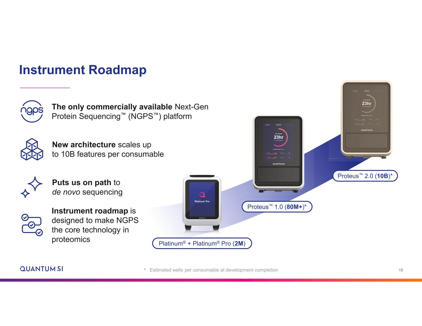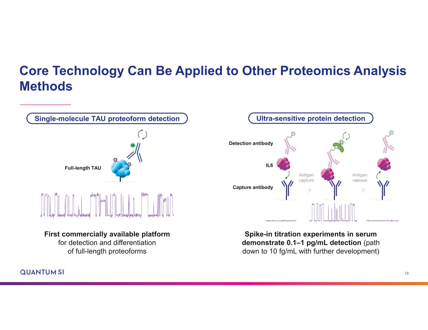 18 Core Technology Can Be Applied to Other Proteomics Analysis Methods IL6 Capture antibody Detection antibody Antigen capture Antigen release Spike-in titration experiments in serum demonstrate 0.1–1 pg/mL detection (path down to 10 fg/mL with further development) Full-length TAU Single-molecule TAU proteoform detection Ultra-sensitive protein detection First commercially available platform for detection and differentiation of full-length proteoforms