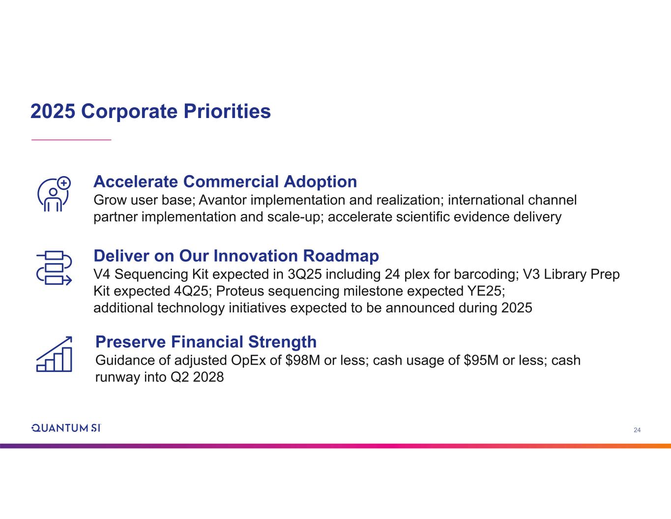 24 2025 Corporate Priorities Accelerate Commercial Adoption Grow user base; Avantor implementation and realization; international channel partner implementation and scale-up; accelerate scientific evidence delivery Deliver on Our Innovation Roadmap V4 Sequencing Kit expected in 3Q25 including 24 plex for barcoding; V3 Library Prep Kit expected 4Q25; Proteus sequencing milestone expected YE25; additional technology initiatives expected to be announced during 2025 Preserve Financial Strength Guidance of adjusted OpEx of $98M or less; cash usage of $95M or less; cash runway into Q2 2028