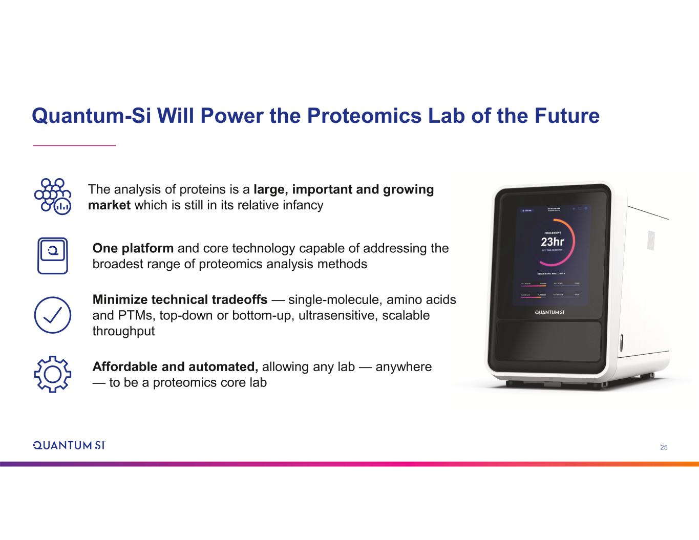 2 Disclaimer and Other Information Forward-looking Statements This presentation includes "forward-looking statements" within the meaning of the "safe harbor" provisions of the United States Private Securities Litigation Reform Act of 1995. The actual results of Quantum-Si Incorporated (the “Company”) may differ from its expectations, estimates, and projections and, consequently, you should not rely on these forward-looking statements as predictions of future events. Words such as "expect," "estimate," "project," "budget," "forecast," "anticipate," "intend," "plan," "may," "will," "could," "should," "believes," "predicts," "potential," "continue," and similar expressions (or the negative versions of such words or expressions) are intended to identify such forward-looking statements. These forward-looking statements include, without limitation, the Company's expectations with respect to future performance and development and commercialization of products and services, its anticipated cash runway and any financial guidance for the interim periods and full year 2025. These forward-looking statements involve significant risks and uncertainties that could cause the actual results to differ materially from those discussed in the forward- looking statements. Most of these factors are outside the Company's control and are difficult to predict. Factors that may cause such differences include, but are not limited to: the inability to maintain the listing of the Company's Class A common stock on The Nasdaq Stock Market; the ability of the Company to grow and manage growth profitably and retain its key employees; the Company’s ongoing leadership transitions; changes in applicable laws or regulations; the ability of the Company to raise financing in the future; the success, cost and timing of the Company's product development and commercialization activities; the commercialization and adoption of the Company’s existing products and the success of any product the Company may offer in the future; the potential attributes and benefits of the Company’s commercialized Platinum® line of protein sequencing instruments and kits and the Company’s other products once commercialized; the Company's ability to obtain and maintain regulatory approval for its products, and any related restrictions and limitations of any approved product; the Company's ability to identify, in-license or acquire additional technology; the Company's ability to maintain its existing lease, license, manufacture and supply agreements; the Company's ability to compete with other companies currently marketing or engaged in the development or commercialization of products and services that serve customers engaged in proteomic analysis, many of which have greater financial and marketing resources than the Company; the size and growth potential of the markets for the Company's products and services, and its ability to serve those markets once commercialized, either alone or in partnership with others; the Company's estimates regarding future expenses, future revenue, capital requirements and needs for additional financing; the Company's financial performance; and other risks and uncertainties described under "Risk Factors" in the Company’s most recent Annual Report on Form 10-K, and in the Company's other filings with the SEC. The Company cautions that the foregoing list of factors is not exclusive. The Company cautions readers not to place undue reliance upon any forward-looking statements, which speak only as of the date made. The Company does not undertake or accept any obligation or undertaking to release publicly any updates or revisions to any forward-looking statements to reflect any change in its expectations or any change in events, conditions, or circumstances on which any such statement is based. Non-GAAP Financial Measures This presentation includes certain non-GAAP financial measures including “adjusted total operating expenses.” Please see .2 to the Company’s Current Report on Form 8-K filed with the SEC on August 5, 2025, for further discussion of the Company’s use of non-GAAP financial measures.