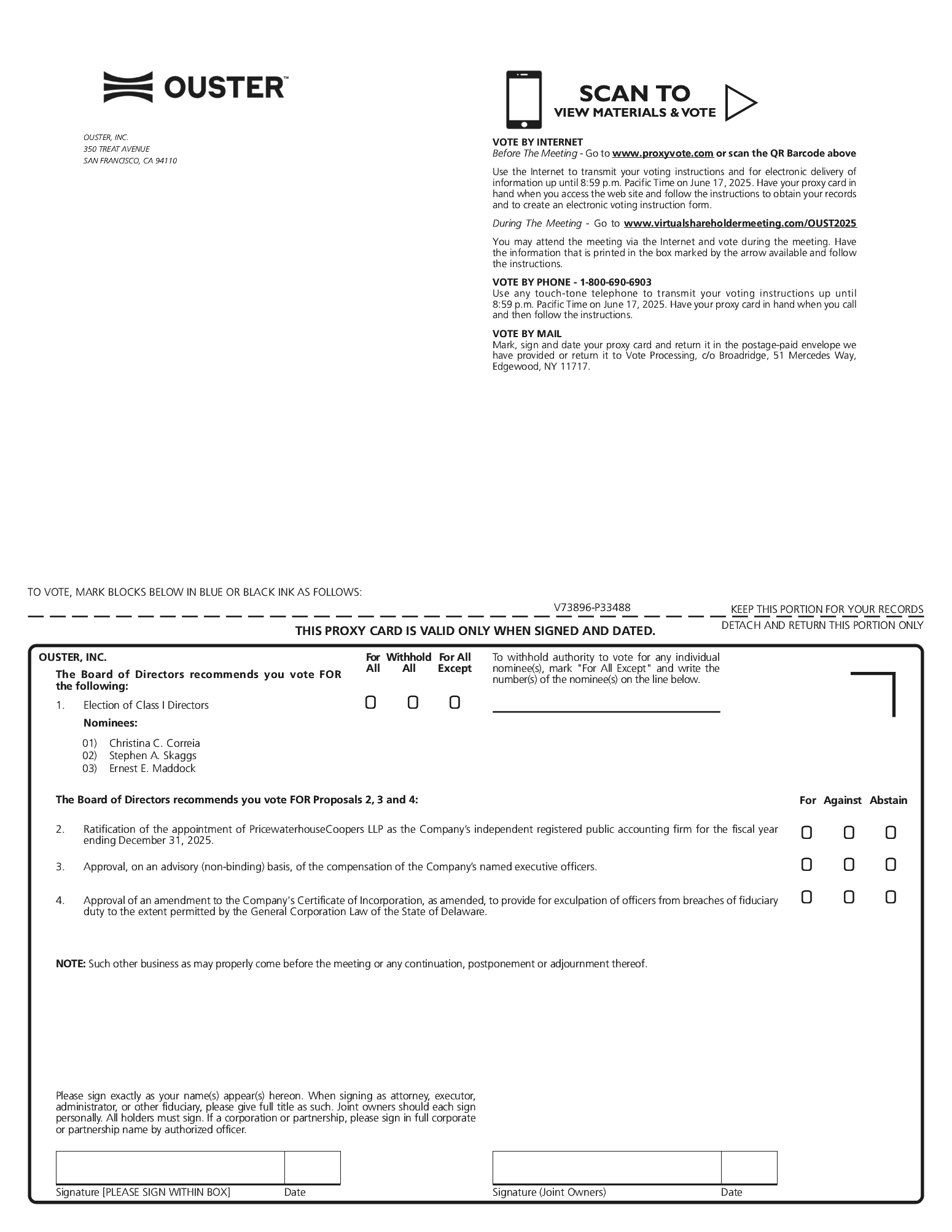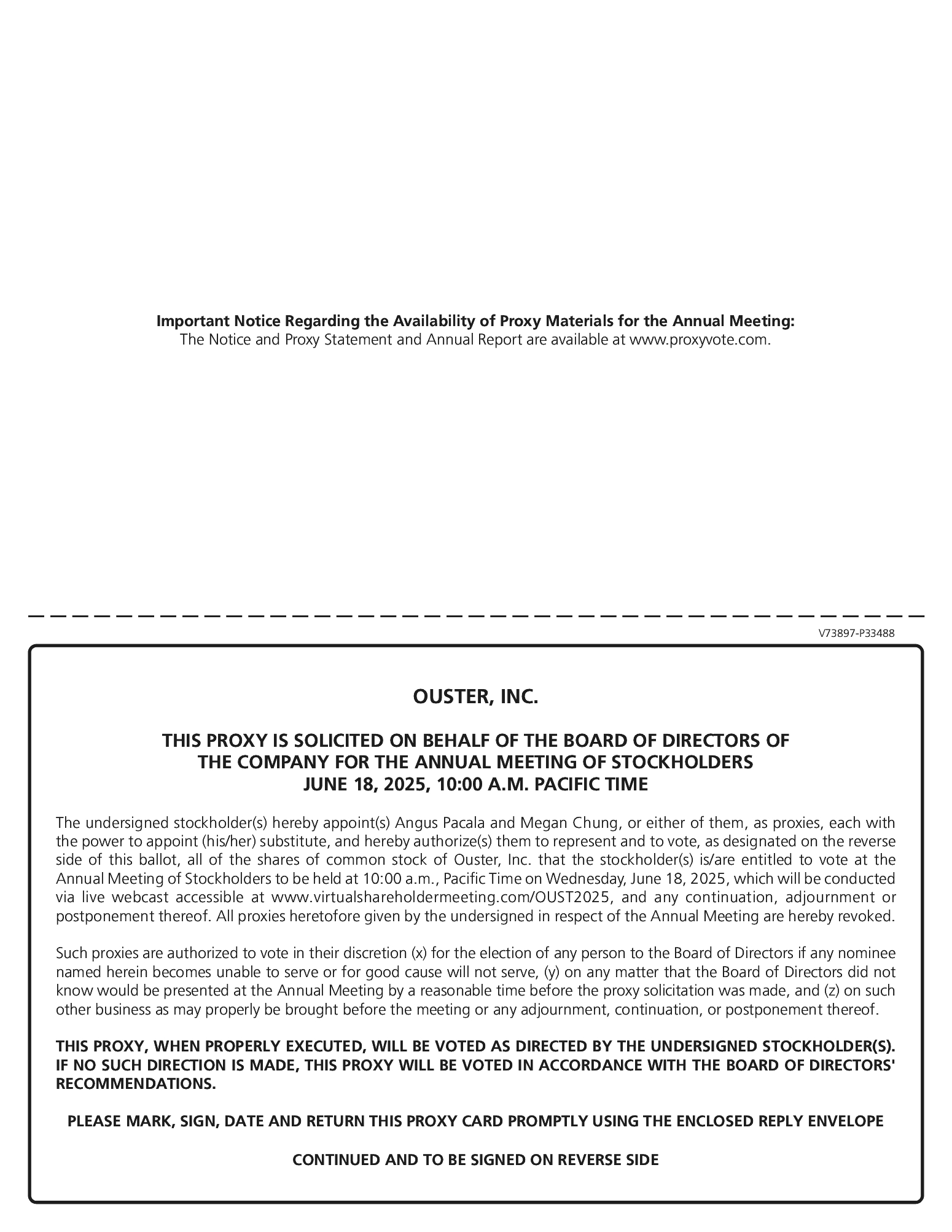 You may attend and vote at the Annual Meeting only if you are an Ouster stockholder who is entitled to vote at the Annual Meeting, or if you hold a valid proxy for the Annual Meeting. The Annual Meeting will be held entirely online to allow greater participation. You will be able to attend the Annual Meeting and submit your questions by visiting the following website: www.virtualshareholdermeeting.com/OUST2025. You will also be able to vote your shares electronically at the Annual Meeting.