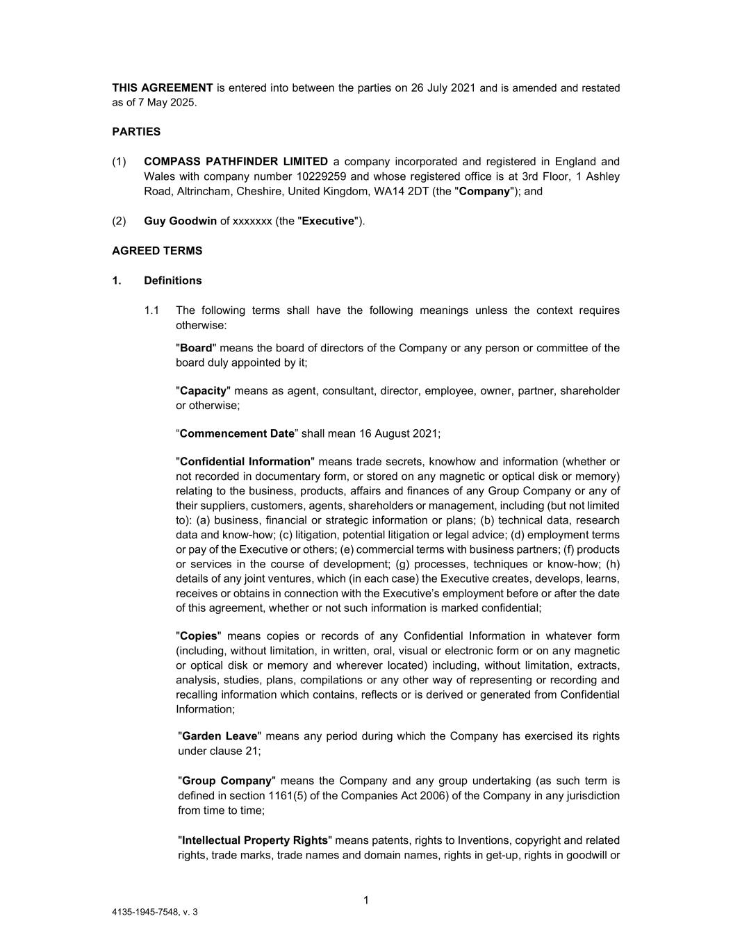 1  4135-1945-7548, v. 3  THIS AGREEMENT is entered into between the parties on 26 July 2021 and is amended and restated  as of 7 May 2025.    PARTIES    (1) COMPASS PATHFINDER LIMITED a company incorporated and registered in England and  Wales with company number 10229259 and whose registered office is at 3rd Floor, 1 Ashley  Road, Altrincham, Cheshire, United Kingdom, WA14 2DT (the "Company"); and    (2) Guy Goodwin of xxxxxxx (the "Executive").    AGREED TERMS    1. Definitions    1.1 The following terms shall have the following meanings unless the context requires  otherwise:  "Board" means the board of directors of the Company or any person or committee of the  board duly appointed by it;  "Capacity" means as agent, consultant, director, employee, owner, partner, shareholder  or otherwise;  “Commencement Date” shall mean 16 August 2021;  "Confidential Information" means trade secrets, knowhow and information (whether or  not recorded in documentary form, or stored on any magnetic or optical disk or memory)  relating to the business, products, affairs and finances of any Group Company or any of  their suppliers, customers, agents, shareholders or management, including (but not limited  to): (a) business, financial or strategic information or plans; (b) technical data, research  data and know-how; (c) litigation, potential litigation or legal advice; (d) employment terms  or pay of the Executive or others; (e) commercial terms with business partners; (f) products  or services in the course of development; (g) processes, techniques or know-how; (h)  details of any joint ventures, which (in each case) the Executive creates, develops, learns,  receives or obtains in connection with the Executive’s employment before or after the date  of this agreement, whether or not such information is marked confidential;   "Copies" means copies or records of any Confidential Information in whatever form  (including, without limitation, in written, oral, visual or electronic form or on any magnetic  or optical disk or memory and wherever located) including, without limitation, extracts,  analysis, studies, plans, compilations or any other way of representing or recording and  recalling information which contains, reflects or is derived or generated from Confidential  Information;  "Garden Leave" means any period during which the Company has exercised its rights  under clause 21;    "Group Company" means the Company and any group undertaking (as such term is  defined in section 1161(5) of the Companies Act 2006) of the Company in any jurisdiction  from time to time;      "Intellectual Property Rights" means patents, rights to Inventions, copyright and related  rights, trade marks, trade names and domain names, rights in get-up, rights in goodwill or