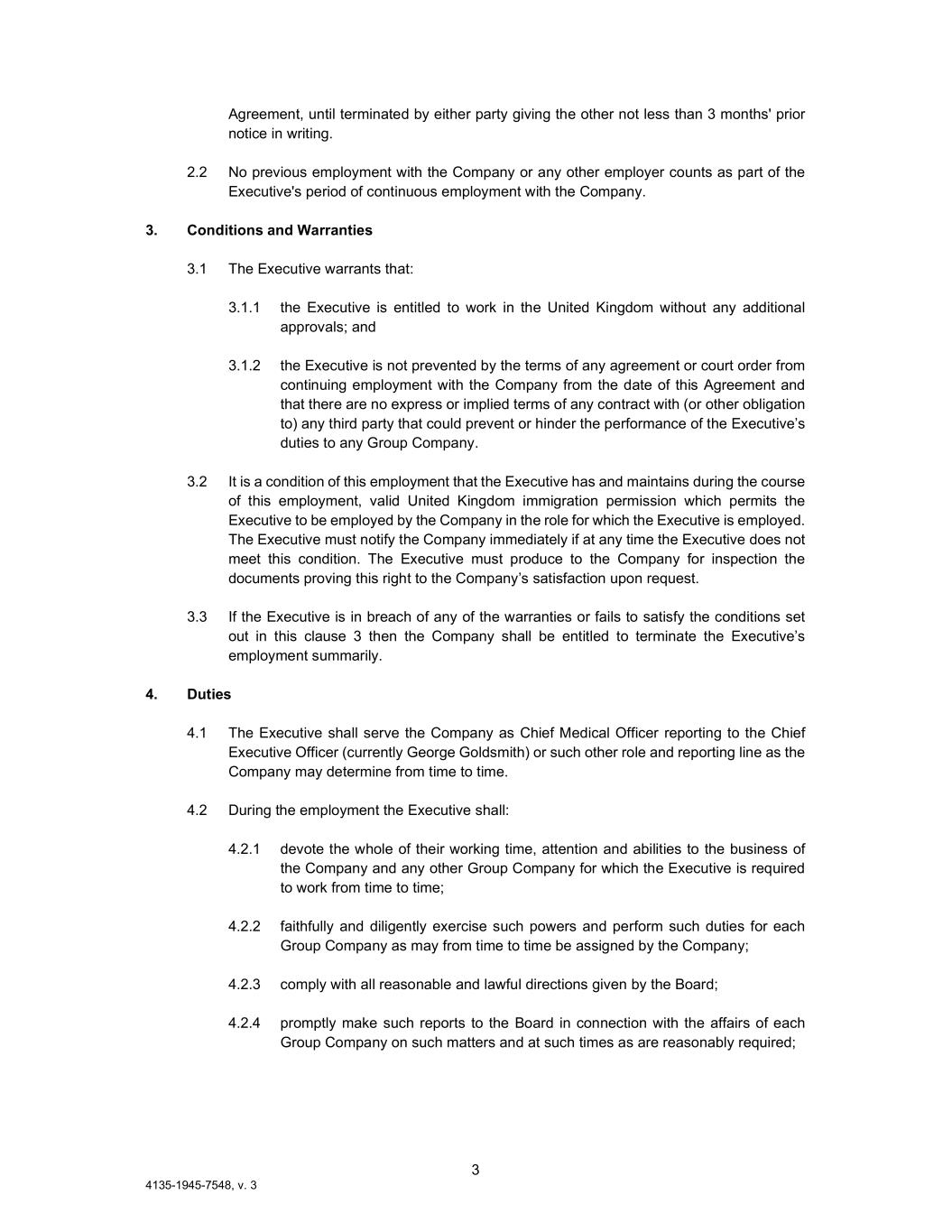 3  4135-1945-7548, v. 3  Agreement, until terminated by either party giving the other not less than 3 months' prior  notice in writing.     2.2 No previous employment with the Company or any other employer counts as part of the  Executive's period of continuous employment with the Company.    3. Conditions and Warranties    3.1 The Executive warrants that:    3.1.1 the Executive is entitled to work in the United Kingdom without any additional  approvals; and    3.1.2 the Executive is not prevented by the terms of any agreement or court order from  continuing employment with the Company from the date of this Agreement and  that there are no express or implied terms of any contract with (or other obligation  to) any third party that could prevent or hinder the performance of the Executive’s  duties to any Group Company.    3.2 It is a condition of this employment that the Executive has and maintains during the course  of this employment, valid United Kingdom immigration permission which permits the  Executive to be employed by the Company in the role for which the Executive is employed.  The Executive must notify the Company immediately if at any time the Executive does not  meet this condition. The Executive must produce to the Company for inspection the  documents proving this right to the Company’s satisfaction upon request.    3.3 If the Executive is in breach of any of the warranties or fails to satisfy the conditions set  out in this clause 3 then the Company shall be entitled to terminate the Executive’s  employment summarily.     4. Duties    4.1 The Executive shall serve the Company as Chief Medical Officer reporting to the Chief  Executive Officer (currently George Goldsmith) or such other role and reporting line as the  Company may determine from time to time.     4.2 During the employment the Executive shall:    4.2.1 devote the whole of their working time, attention and abilities to the business of  the Company and any other Group Company for which the Executive is required  to work from time to time;    4.2.2 faithfully and diligently exercise such powers and perform such duties for each  Group Company as may from time to time be assigned by the Company;    4.2.3 comply with all reasonable and lawful directions given by the Board;    4.2.4 promptly make such reports to the Board in connection with the affairs of each  Group Company on such matters and at such times as are reasonably required;